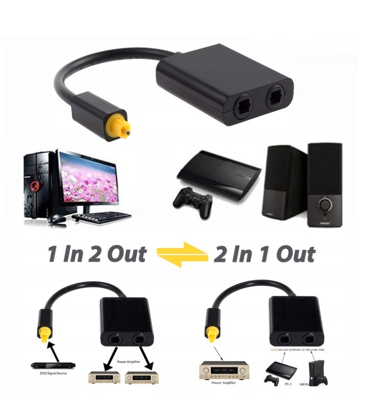 - Функція : адаптер Toslink 1 в 2 дозволяє підключити одне джерело аудіо до двох різних приймачів. Цифрові джерела аудіо, такі як CD/DVD -програвачі, PS3, Xbox360, комп'ютер. Слід пам’ятати, що він не сумісний з продуктами LG