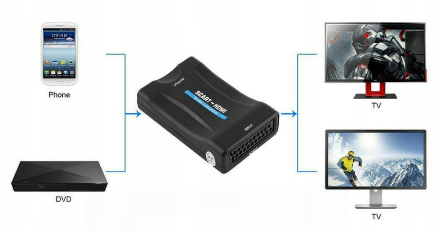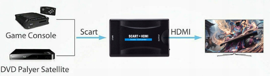 адаптер Scar-HDMI-це пристрій для перетворення зображення та Аналоговий звук до цифрового . Пристрій перетворює аналоговий сигнал з пристроїв із входом Scart, серед інших Декод, консолі або інші трохи старі пристрої для цифрового сигналу 720p/1080p з виходом HDMI.