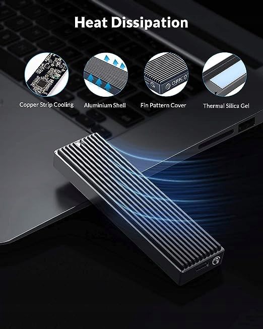 Адаптер m2 nvme прикріплено за допомогою тепловідвідної накладки, мідного стрижня з отворами на платі PCBA, ребриста оболонка для збільшення поверхні розсіювання тепла та верхня кришка з алюмінієвого сплаву для швидкого розсіювання тепла. Результатом є найкраща продуктивність і довший термін служби SSD.