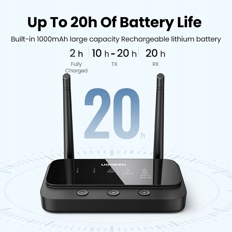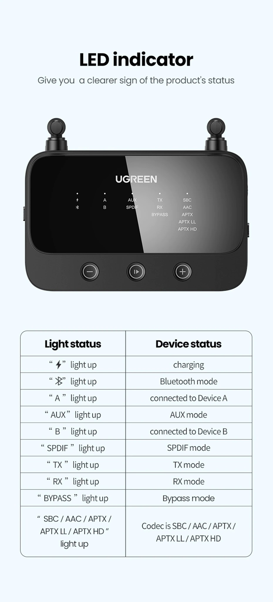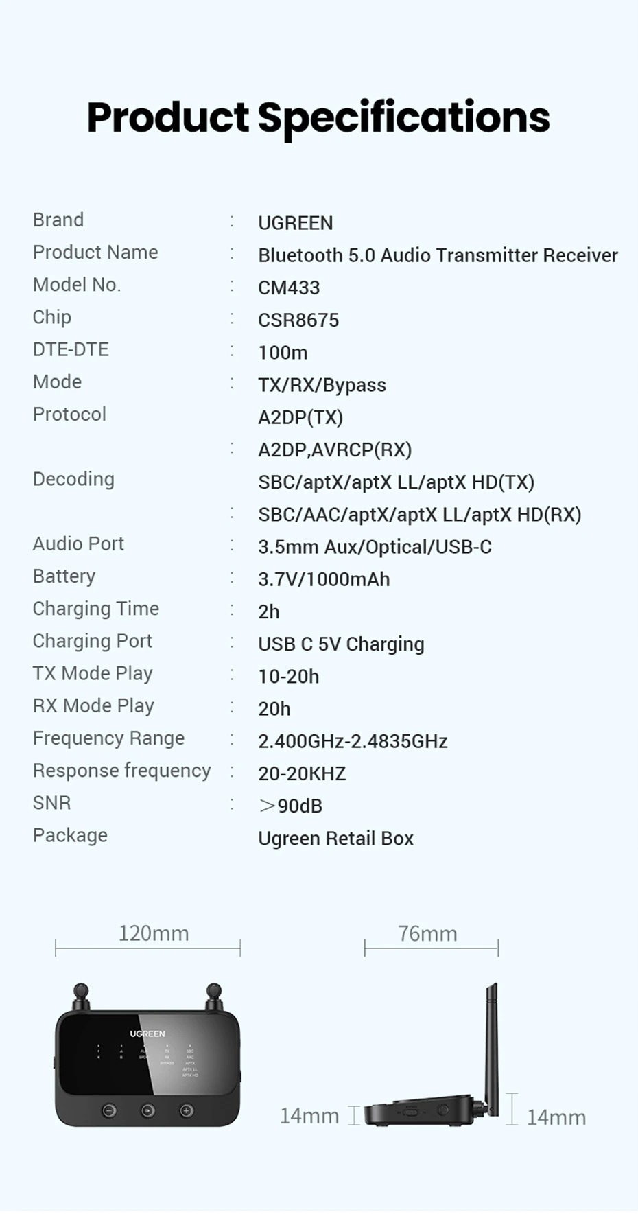 Адаптер CM433 є найбільш технічно передовим пристроєм UGREEN і призначений для найвимогливіших одержувачів. Метою адаптера UGREEN є прийом і передача музики, що передається через зв’язок Bluetooth із таких пристроїв, як смартфон або планшет, від і до таких приймачів як підсилювачі, набір динаміків або автомобільний аудіоплеєр. Адаптер UREEN підтримує останній протокол Qualcomm® aptX™ HD.