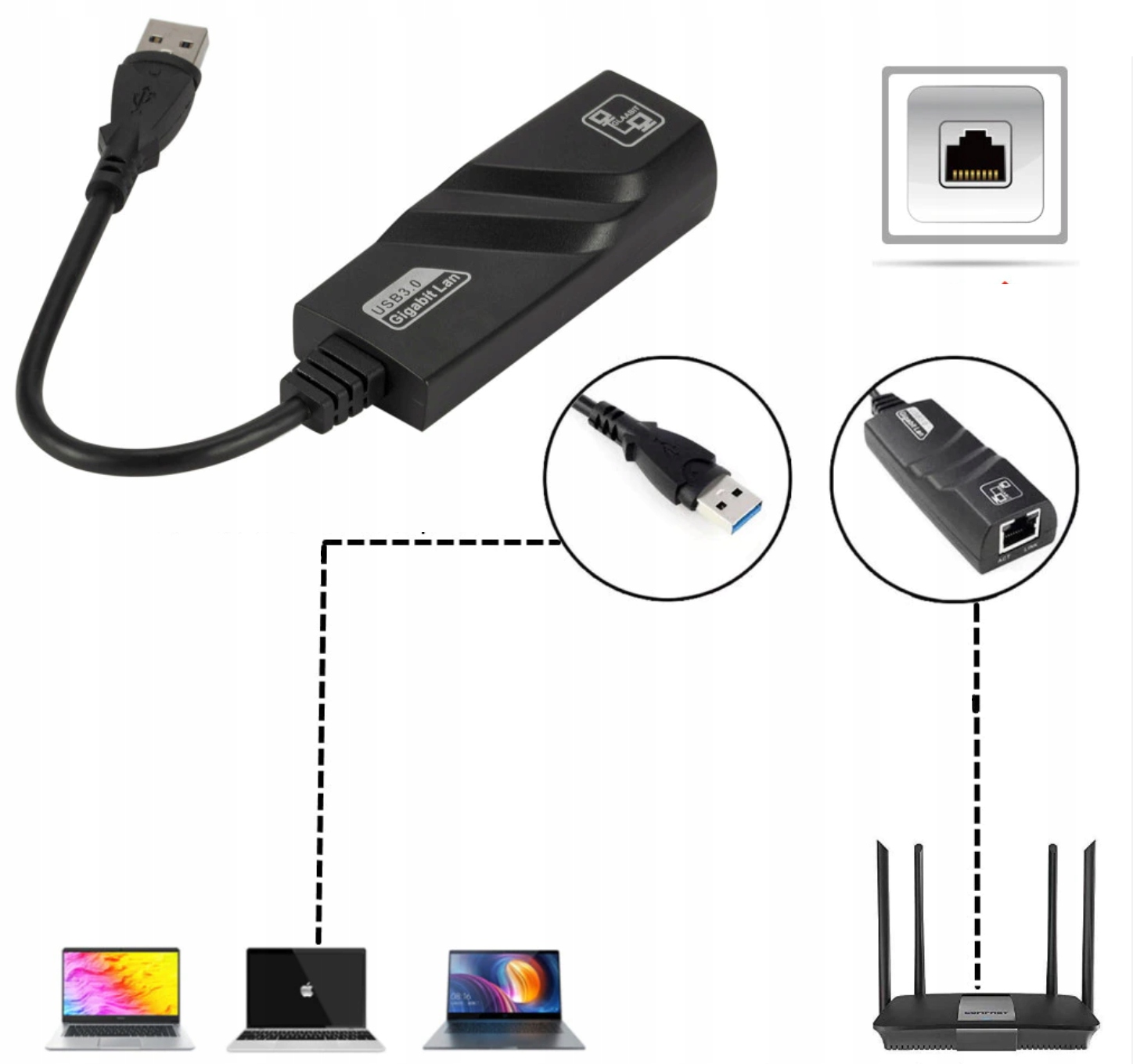 USB Адаптер 3.0 RJ45 - дуже корисний пристрій, завдяки якому ви можете підключатися до Інтернету з максимальною швидкістю 1000 Мбіт/с. Ми підключимо пристрій із портом USB 3.0, наприклад ультрабуки, настільні комп’ютери та ноутбуки, до адаптера, а потім за допомогою кабелю RJ-45 Ethernet до маршрутизатора. Plug&Play - усе працює автоматично без необхідності встановлення будь-якого додаткового програмного забезпечення.