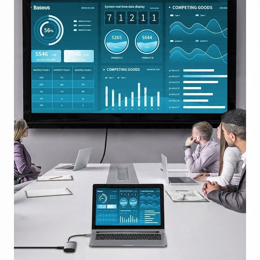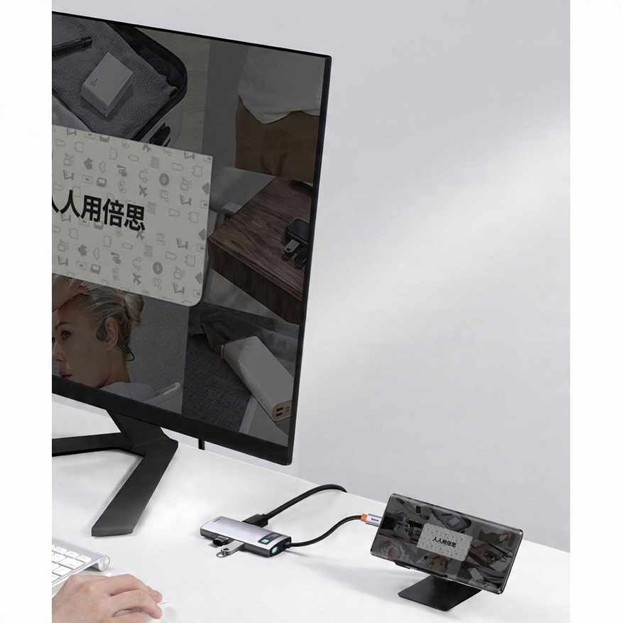Baseus Hub дозволяє підключати все необхідне обладнання для роботи. Дозволяє підключити монітор, телевізор, мишку, клавіатуру або блок живлення. Концентратор має вхід USB-C Power Delivery, USB 2.0, USB 3.0 і HDMI 4K. Кабель USB-C дозволяє підключати концентратор до останніх пристроїв.