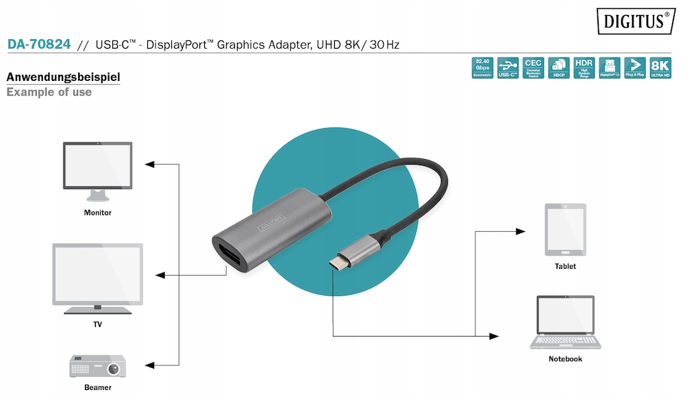 За допомогою кабелю-адаптера DIGITUS® USB-C™ – DisplayPort ви можете під’єднати монітор або телевізор із роз’ємом DisplayPort до інтерфейсу USB-C™ вашого ноутбука чи планшета та надсилати аудіо на свою аудіосистему.