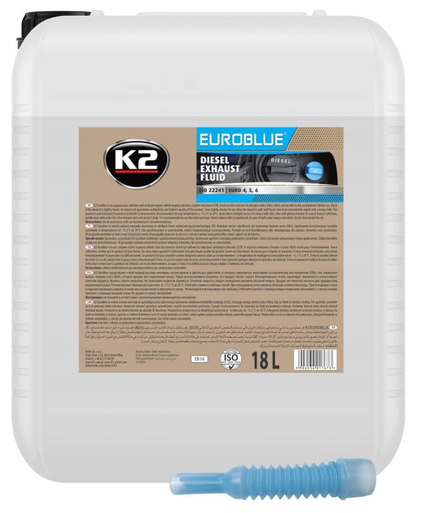 K2 EUROBLUE - це водний розчин сечовини, який використовується в дизельних двигунах з використанням технології селективного каталітичного відновлення (SCR). Зменшує викиди шкідливих для навколишнього середовища оксидів азоту (NOx). Перед використанням переконайтеся, що продукт щільно закритий. Неушкоджена пломба гарантує оригінальність і найвищу якість товару. Тримайте упаковку щільно закритою. Не допускайте розливання рідини.