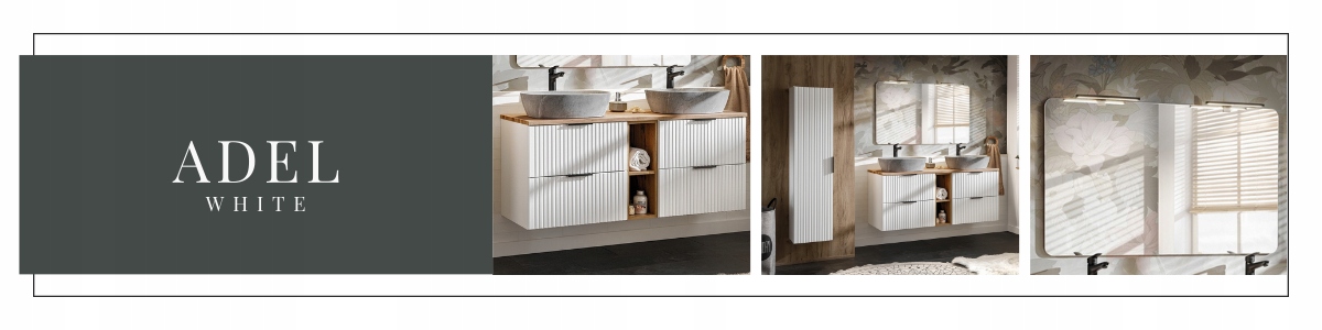 Колекція ADEL у новій, білій версії - це класичні пропорції форм у поєднанні з унікальними вертикально фрезерованими фасадами. Завдяки такому поєднанню меблі цієї колекції є універсальними та ідеально підходять як для сучасного, так і для класичного оформлення, а її висока функціональність забезпечить комфорт навіть найвимогливішим користувачам. Ще однією перевагою цієї колекції є можливість вибору кольору ручок, адже кожна шафа представлена трьома кольорами: глянсове золото, глянсовий хром і матовий чорний. Завдяки цьому ми можемо підібрати колір ручок до фурнітури, дзеркала в різних кольорах рам або в майбутньому оновити зовнішній вигляд меблів.