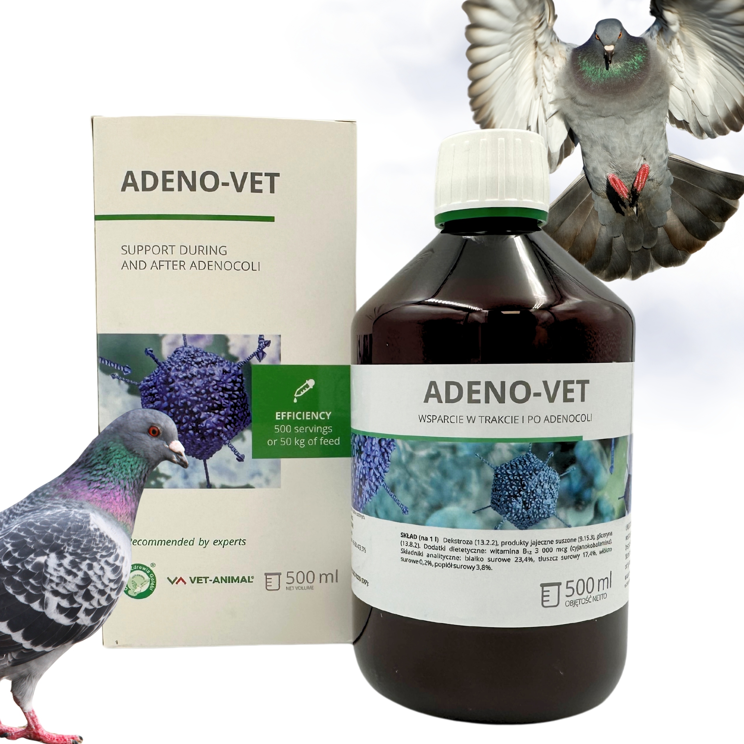 Завдяки своїм інгредієнтам, в основному Saccharomyces cerevisiae, adeno-vet має пребіотичний та пробіотичний ефект , що важливо під час інфекцій, спричинених вірусом/бактеріями (аденоколі), сальмонельозом та отруєнням грибками у молодих та дорослих птахів. Мідь, що міститься в суміші, покращує метаболізм , позитивно впливає на процес відновлення, діарею та проблеми з руховою координацією.