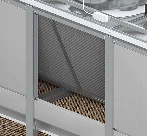 Повністю закрита камера теплообмінника з нижнім крапельним сепаратором, виконаним у структурі целюлозних стільникових стільників. Його призначення — вловлювати вологу з повітря, що надходить з адіабатичної камери, що охолоджує теплообмінники.