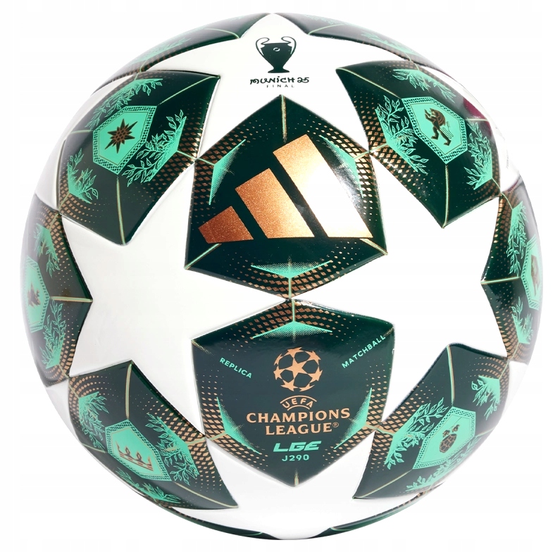 Ліга Adidas League in Green, типовий для міді, покритий Патіном Купол Мюнхена та фон, як листівка, отримує натхнення з дизайну офіційного матчу Ліги чемпіонів УЄФА. Безшовна, гарантуючи передбачувану гру покриття TPU, представляє складні деталі, що стосуються міста та логотипу турніру. Куля вагою всього 290 г ідеально підходить для молодіжних матчів.