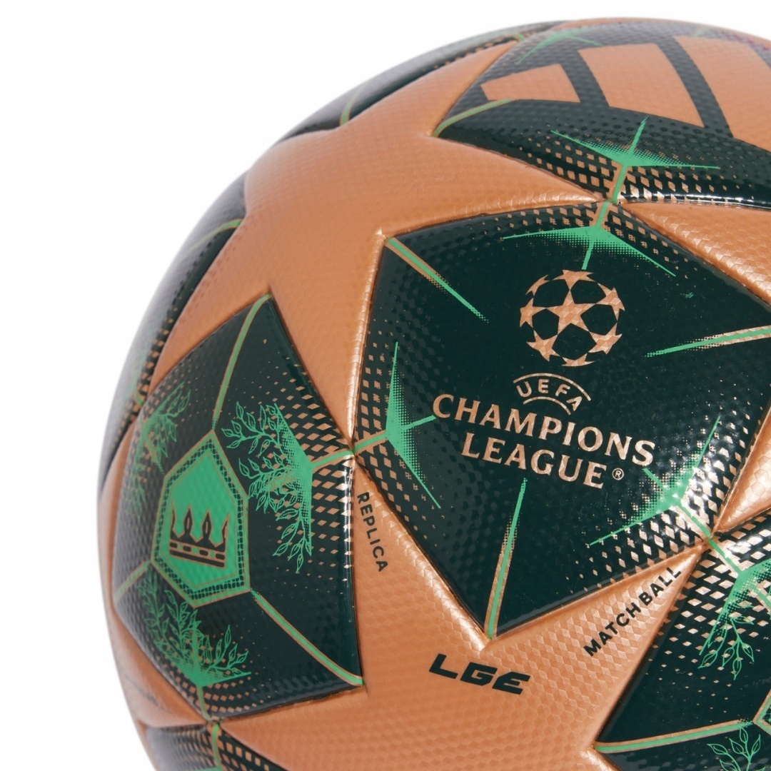 Дизайн м'яча стосується ігор УЄФА, з друкованим логотипом Ліги чемпіонів та Graphics Stars, створюючи ефект просторової глибини. Живі, зелені кольори з елегантними золотими акцентами гарантують чудову видимість та унікальний стиль під час кожної зустрічі.