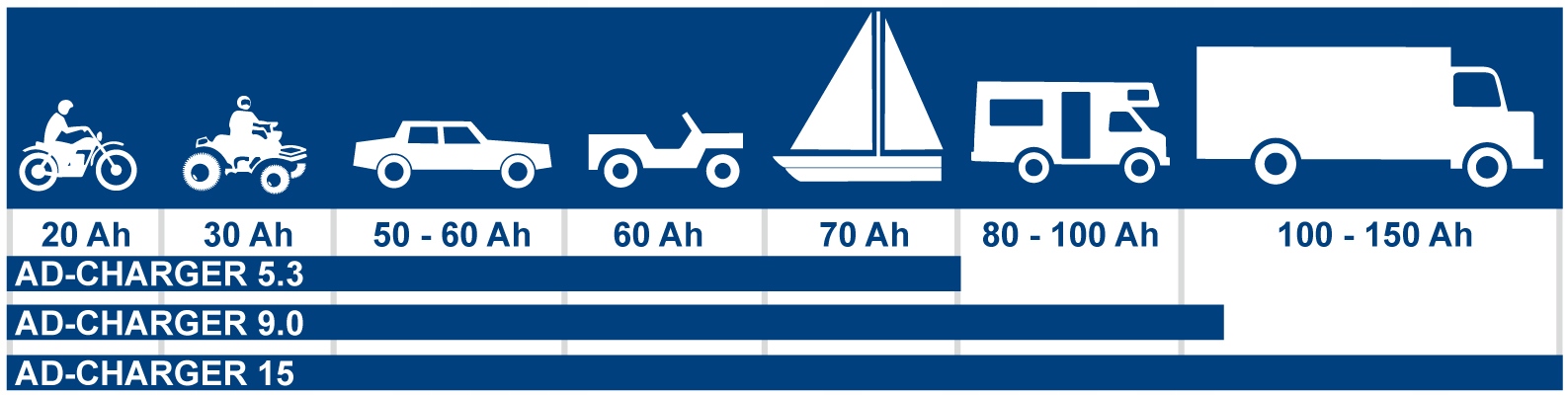 Модель AD CHARGER 15 — це наш найпотужніший електронний зарядний пристрій, який дає змогу заряджати акумулятори мотоциклів, автомобілів, човнів і вантажівок із встановленням 12 В.