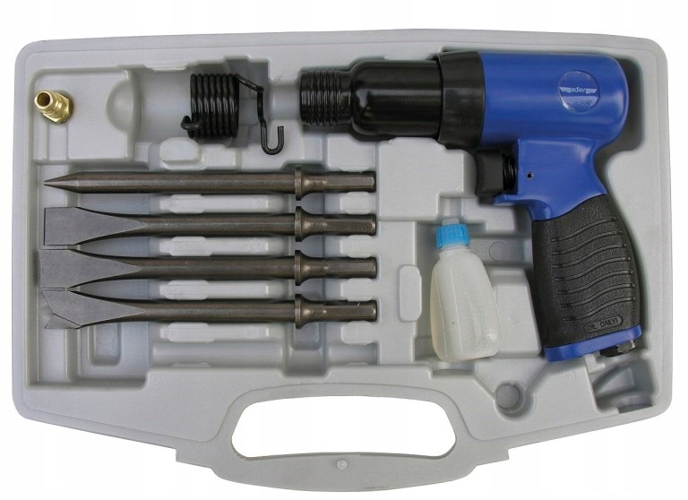 До переваг молотка AD-221 з набору MA064Z можна віднести міцний металевий корпус і зручну прогумовану ручку. Ще однією великою перевагою є велика кількість ударних ходів - (3000 об./хв.) з відносно низьким попитом на стиснене повітря - (100 л/м) і великий хід поршня - (66 мм). Набір знаходиться в пластиковому кейсі, що полегшує зберігання і перенесення інструменту.