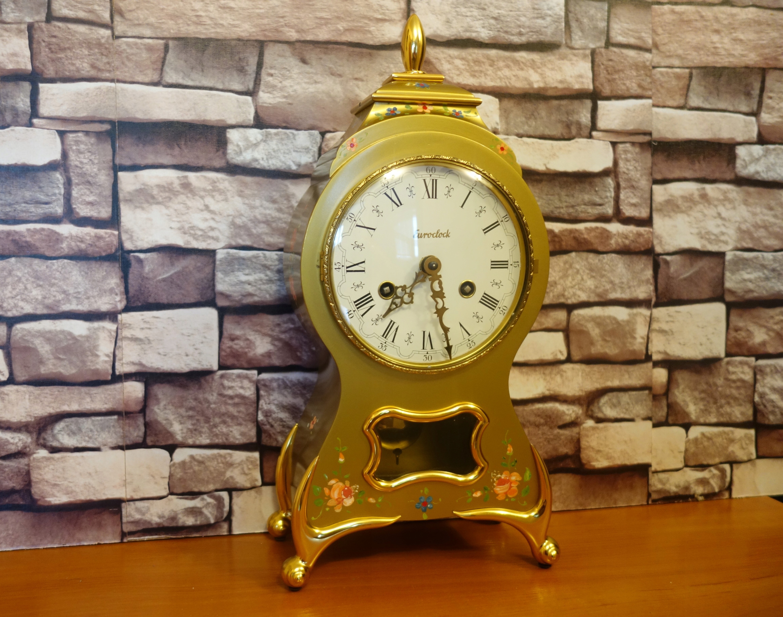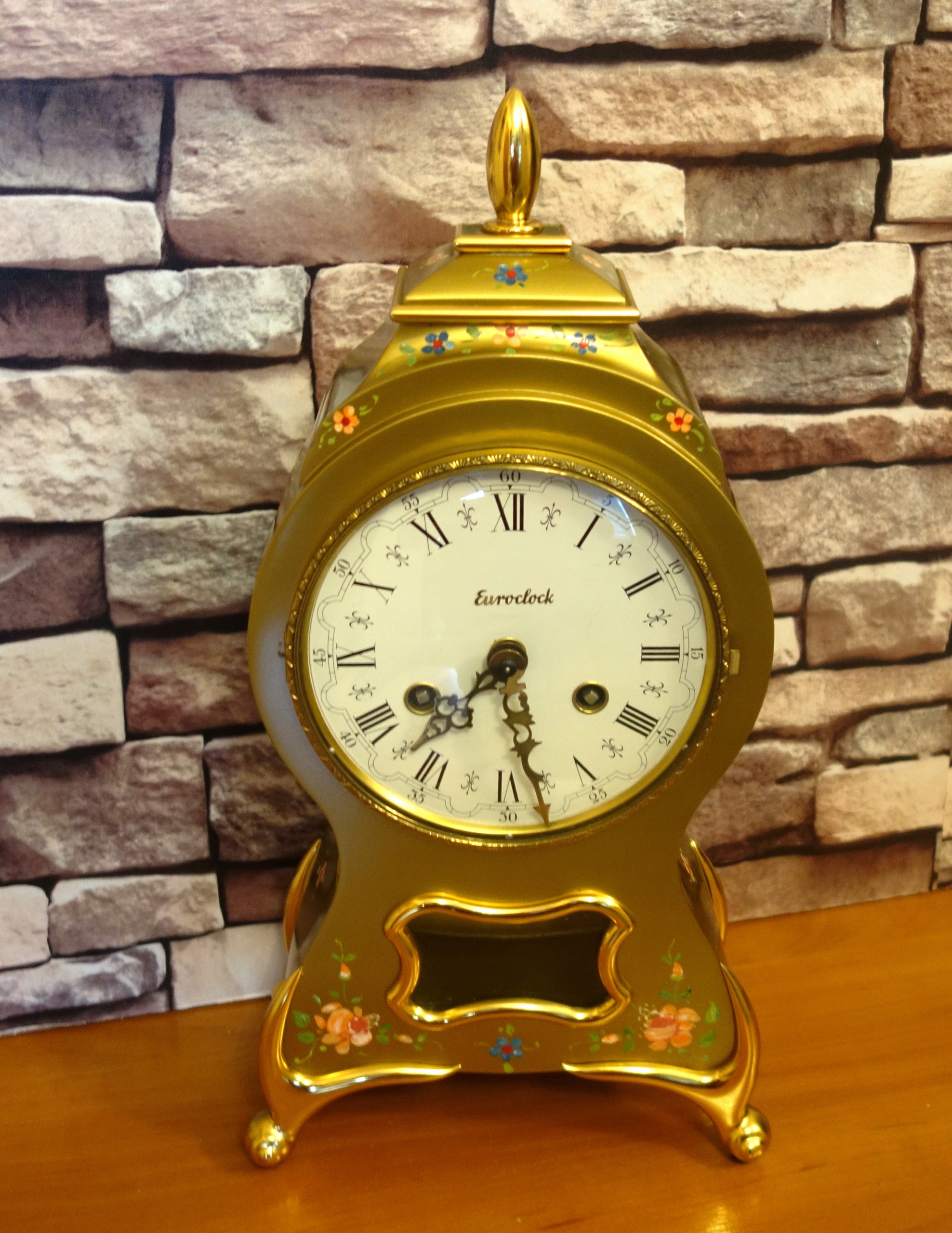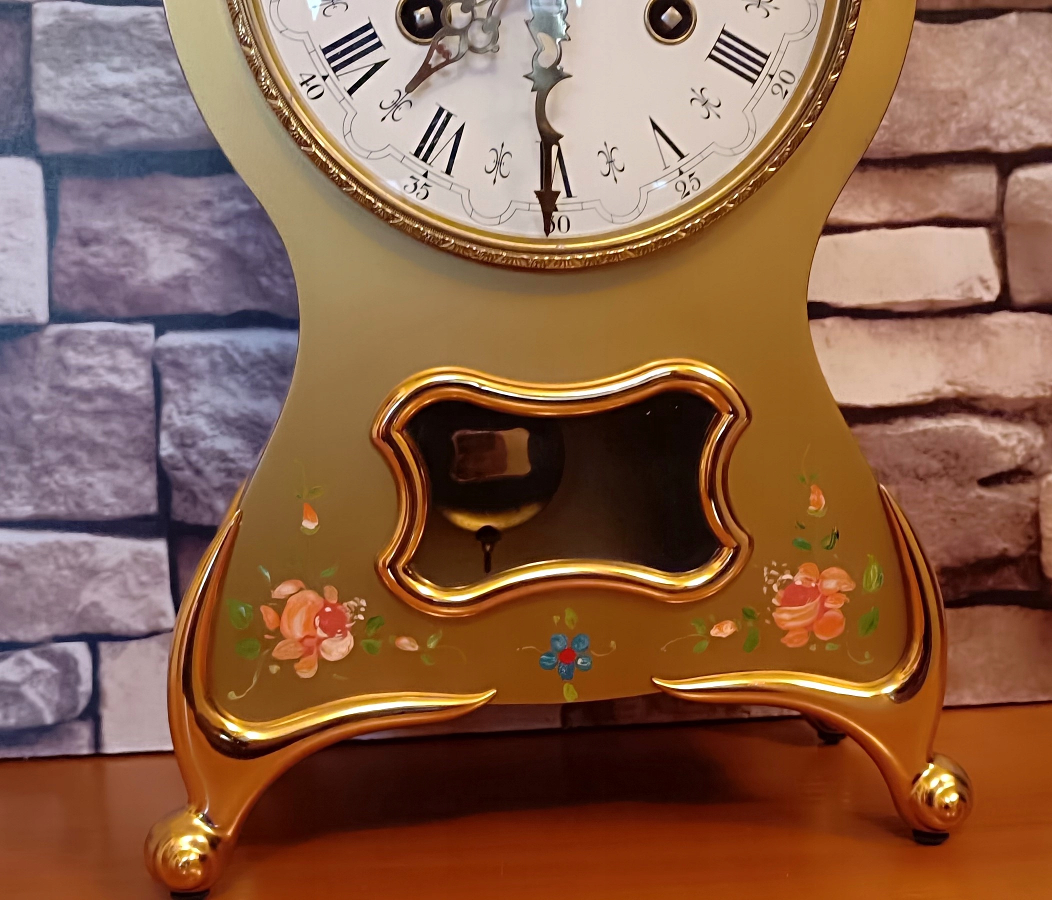 Годинник має гарний металевий (я не знаю, з якого металу чи сплаву) корпус, прикрашений ручним розписом квіткові прикраси. корпус без дефектів, годинник б’є повно і півгодини на двох дзвонах за допомогою двох молотків