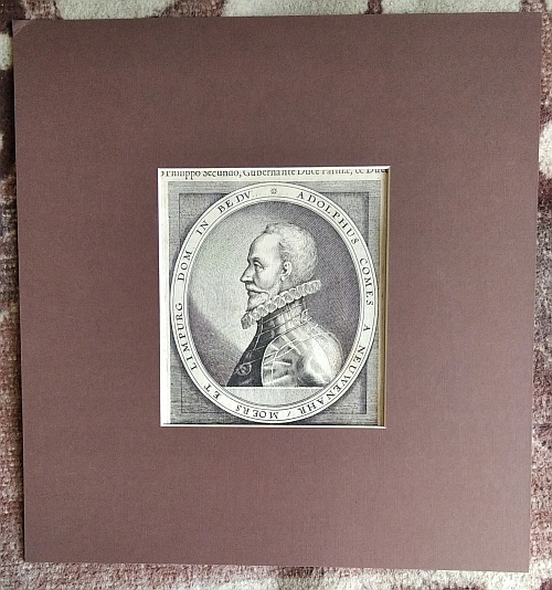 Портрет із зображенням Адольфа ван Ньюенаара (Adolf von Neuenahr, 1545-1589) - графа голландського Мерса і Лімбурга (Limburg) і воєначальника. Гравюра на міді походить від «Descriptio & Figurae rerum Belgiae», 1620 (попереднє видання – Амстердам, Мішель Колін Товойон, 1616). На овалі портрета напис: «Adolphus Comes a Neuwenahr et Limpurg Dom in Bedv».