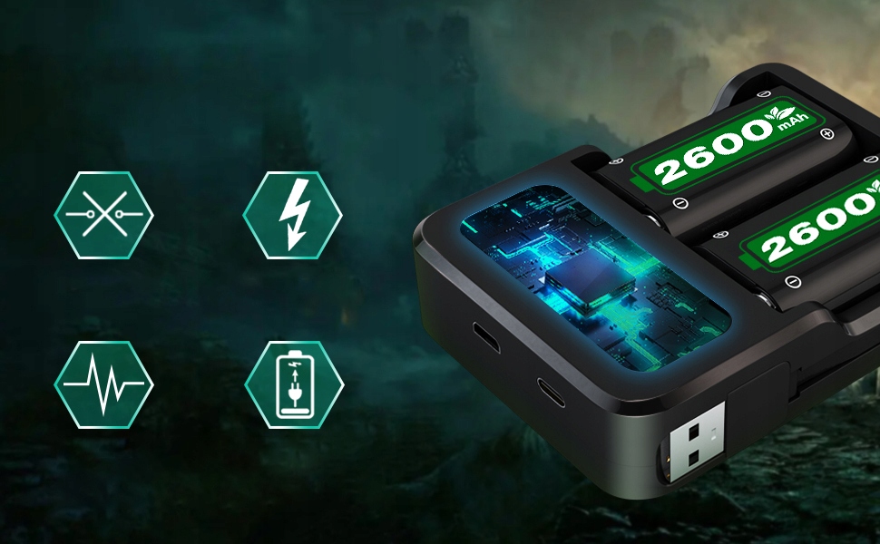 ✅Швидка та безпечна зарядка:батарея контролера та зарядного пристрою Xbox Series X повністю розряджена. заряджається приблизно за 2,5 години. Червоне світло означає зарядку, зелене світло означає повну зарядку. Якщо червоне світло блимає, це означає, що полюси акумулятора заряджені та підключені неправильно. Зарядний пристрій Xbox Controller оснащено інтелектуальним чіпом, який забезпечує захист від перезаряджання, перегріву, перевантаження по струму, перенапруги, короткого замикання та надмірного розряду, допомагаючи вам безпечно насолоджуватися грою.