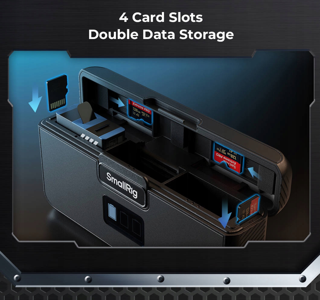 Зарядний чохол пропонує місце для чотирьох карток пам’яті з двома висувними гніздами для карток у верхній частині та двома гніздами для карток, що автоматично висуваються збоку, для зручності зйомки та безпечного зберігання карток.