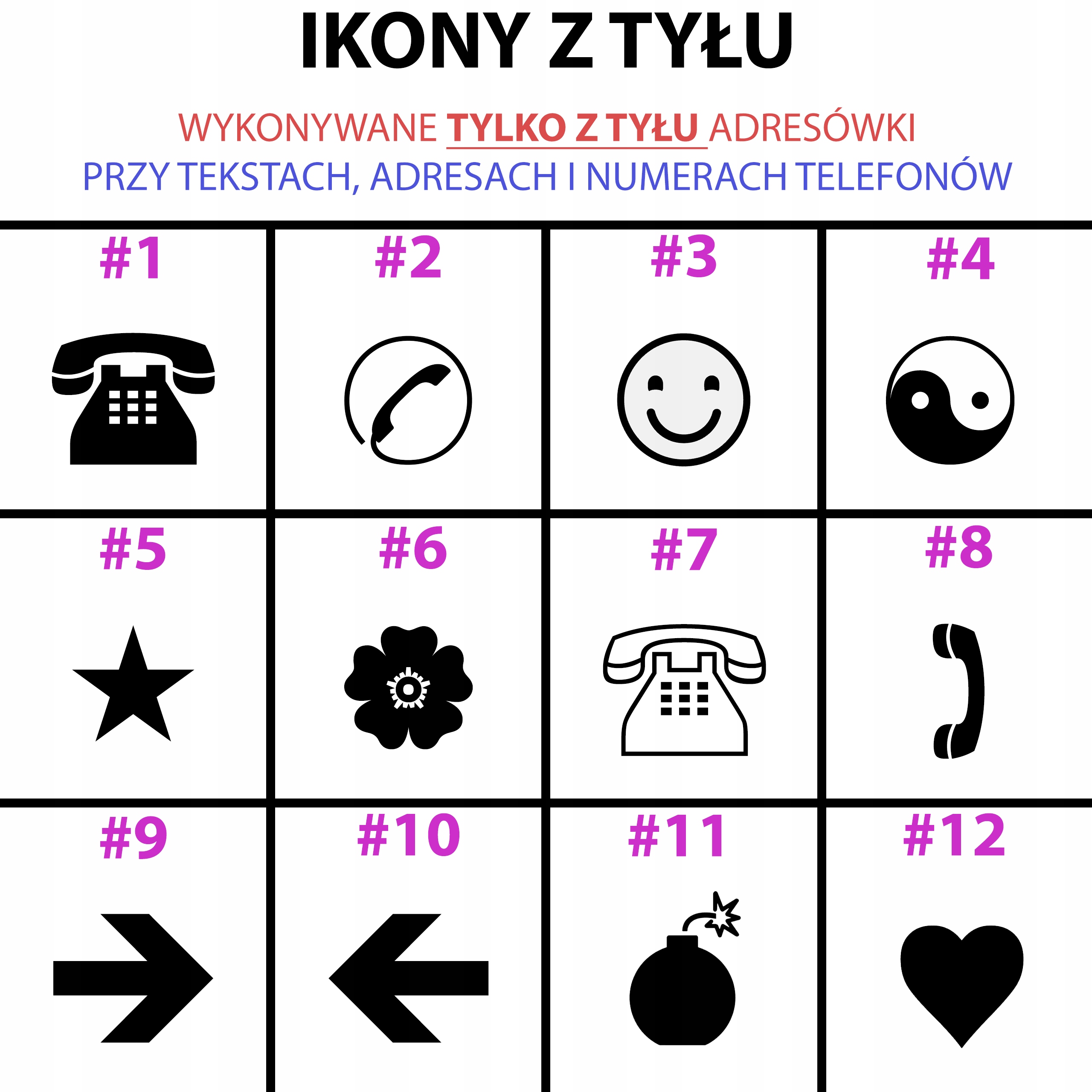 підказка: Не забудьте вказати відповідне позначку поруч із текстом, на якому слід знайти ікону (наприклад, #12 +48 123 456 789, #5 ul. піктограми.