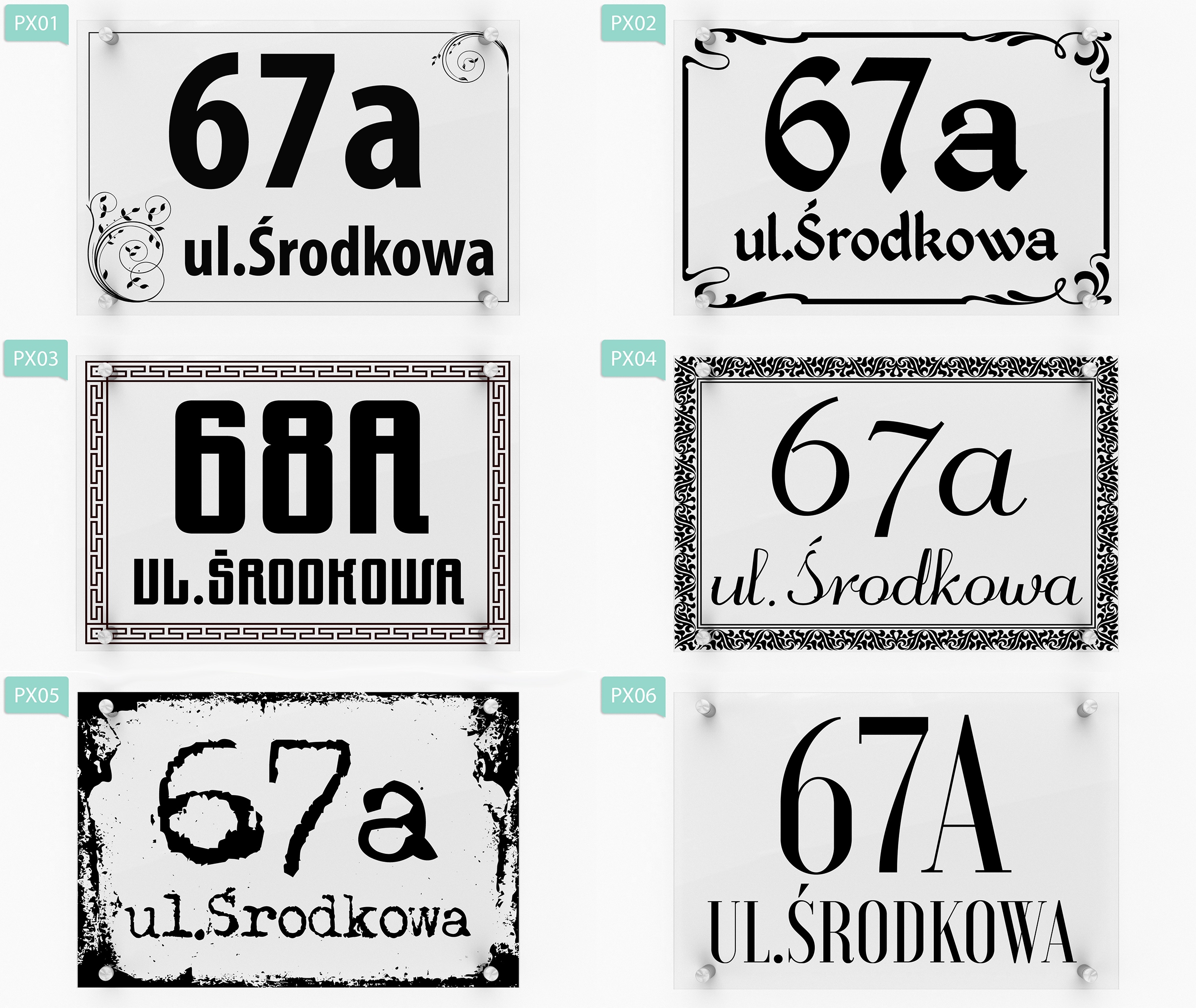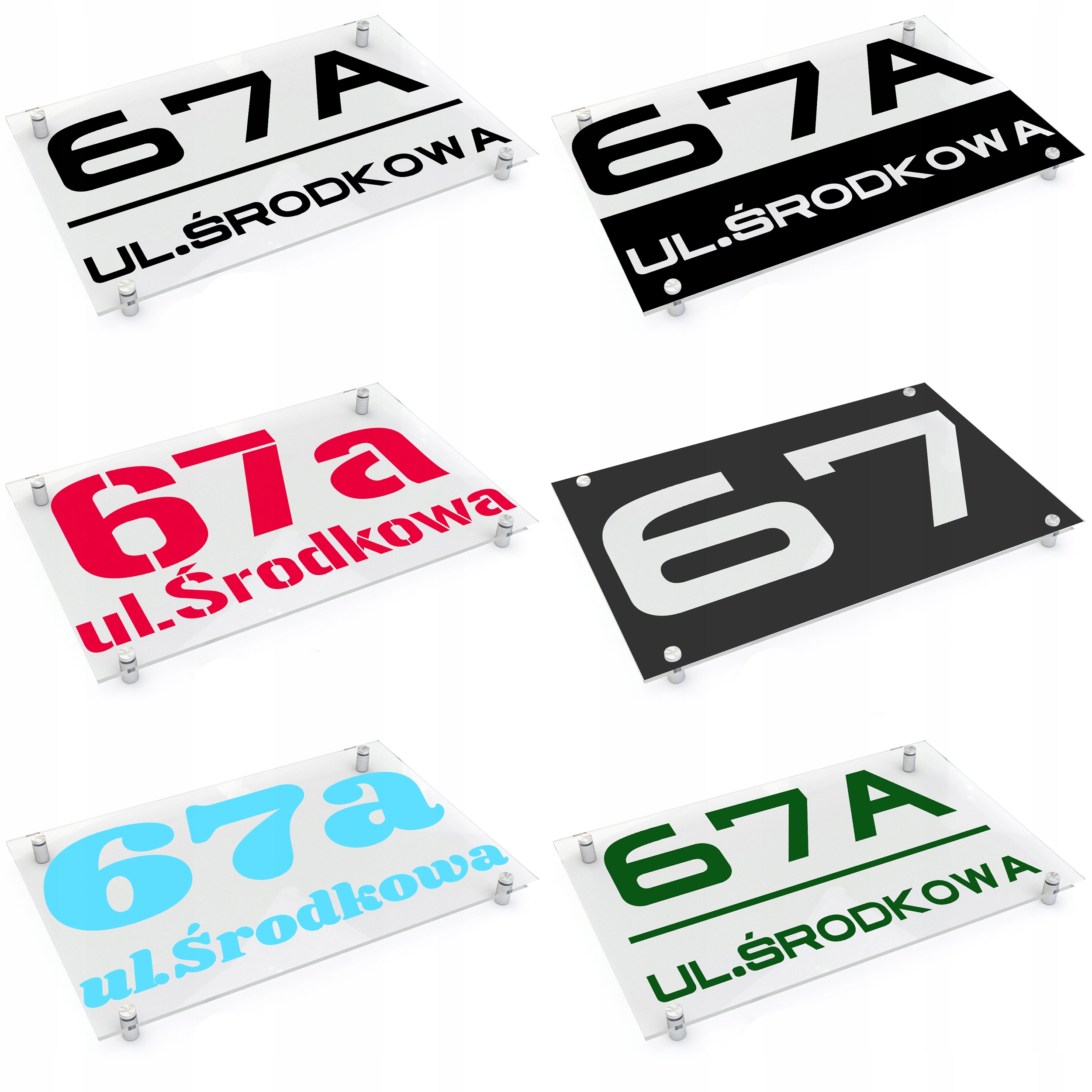 Прозора адресна табличка з номером будинку та вулиці в різних візерунках і кольорах.