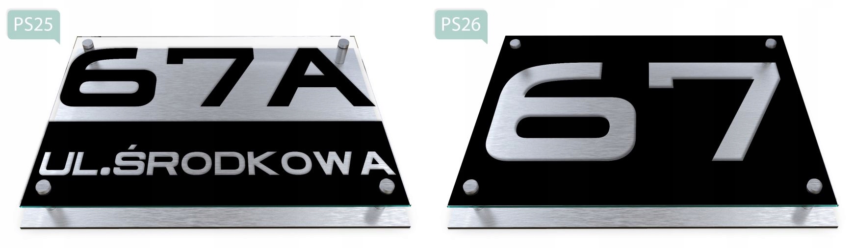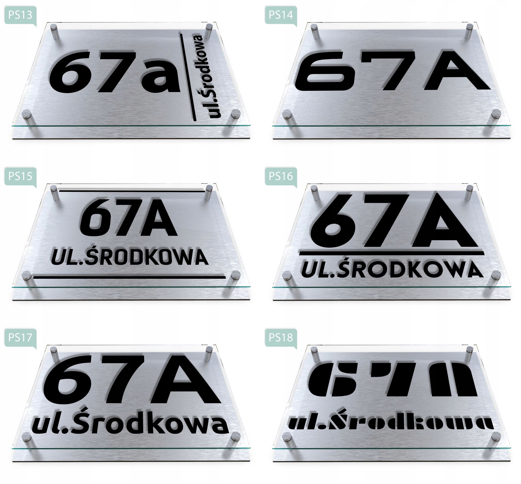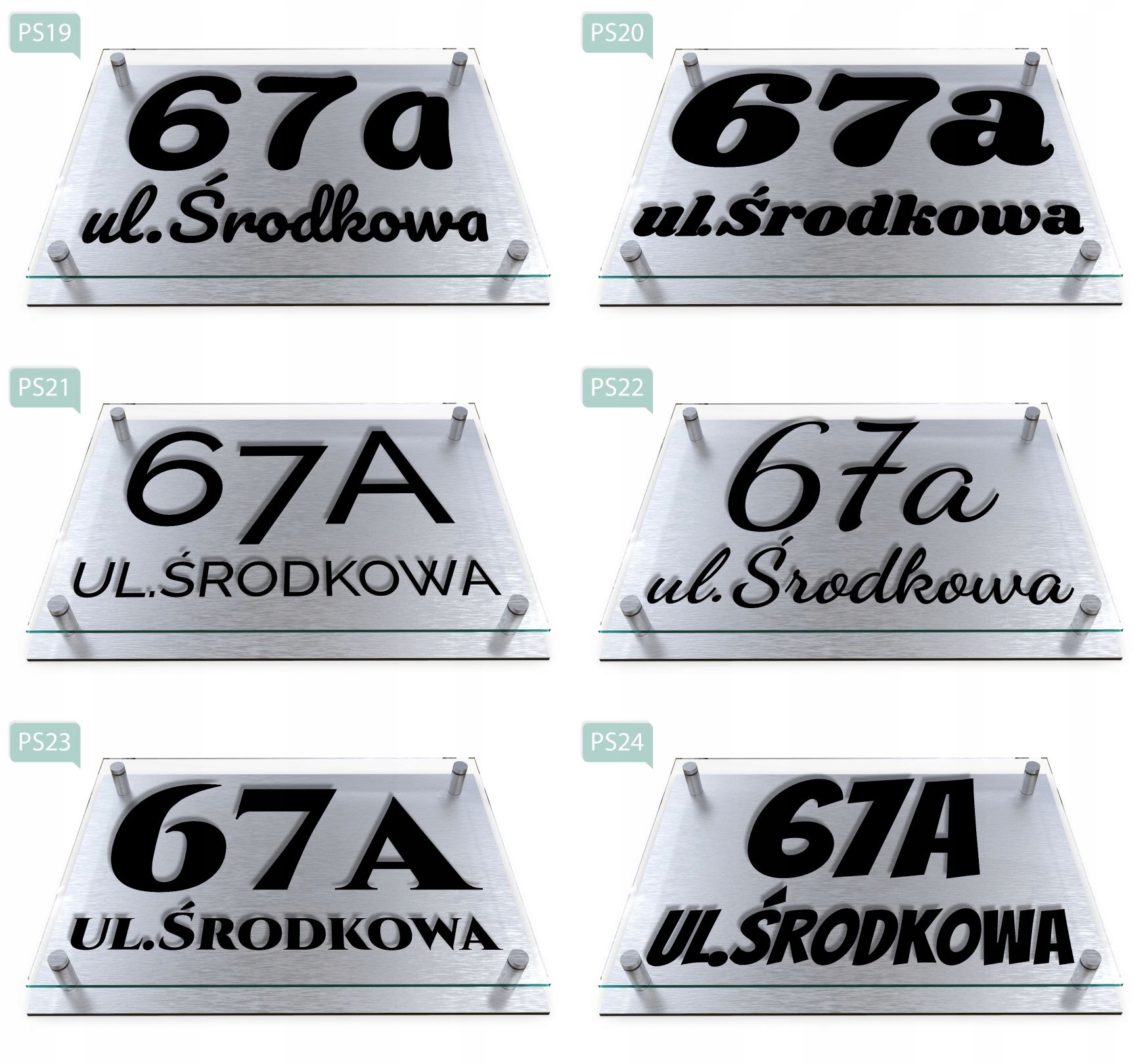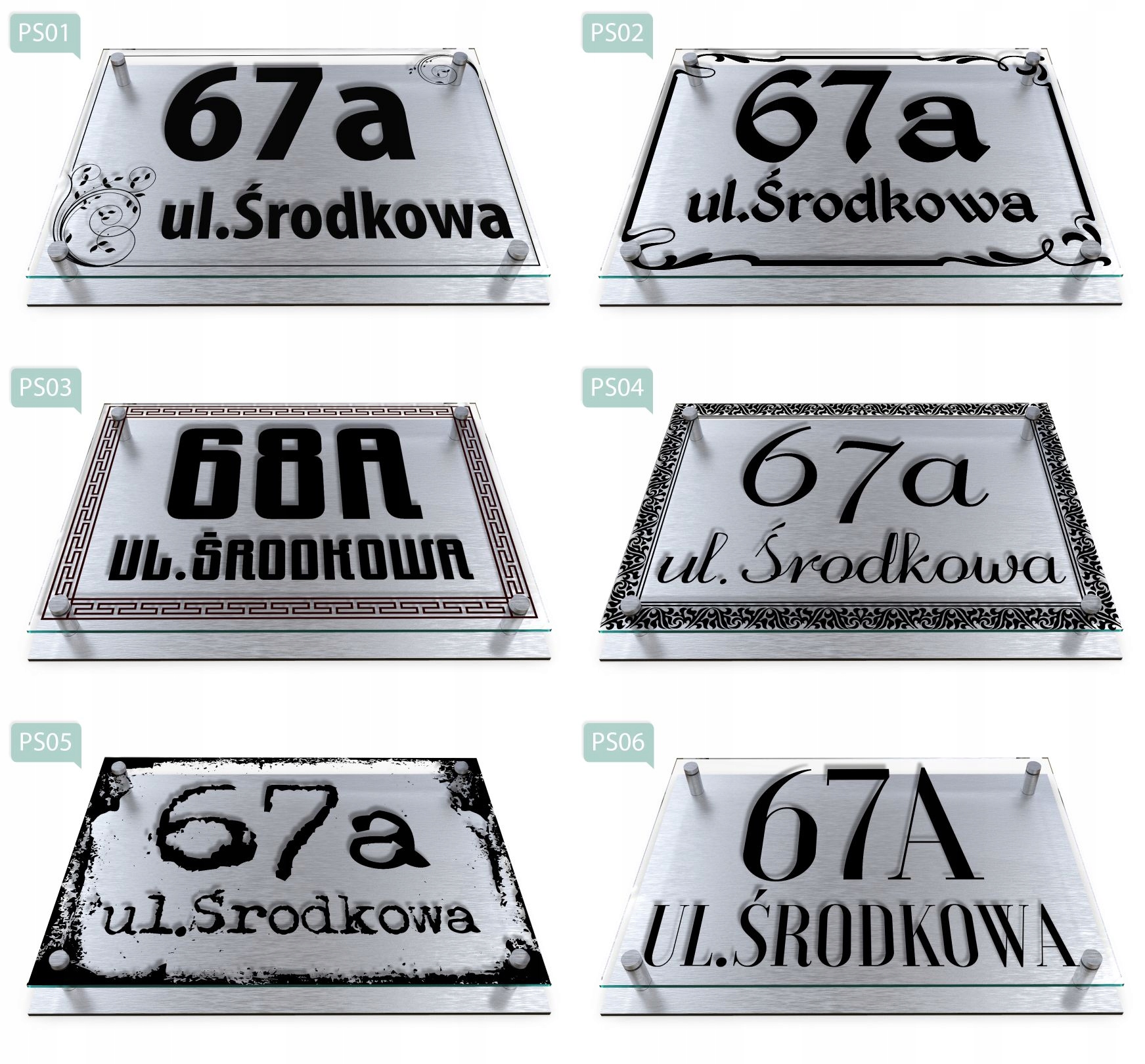 - Зразок замовлення: вул. Ostrowska 14, візерунок PS02, колір номера вулиці/назви рожевий.