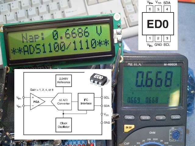 ADS1110 — це повна система збору даних, укладена в мініатюрний корпус SOT23-6. Він включає 16-розрядний дельта-сигма аналого-цифровий перетворювач, джерело опорної напруги, програмований підсилювач (PGA), генератор і послідовний інтерфейс I2C. Сфера застосування – це, перш за все, різноманітні типи вимірювальних програм, що вимагають низького енергоспоживання та мініатюрних компонентів, включаючи портативні медичні пристрої. Внутрішній аналого-цифровий перетворювач пропонує повністю диференціальну архітектуру, механізм автокалібрування та 16-бітну характеристику без т.зв. втрата кодів. Перетворення базуються на внутрішньому еталонному джерелі 2,048 В з точністю 0,05% і дрейфом температури 5 ppm/°C при 15, 30, 60 або 240 вибірках на секунду. Максимальне посилення блоку PGA становить 8 В/В. ADS1110 працює з однією напругою живлення в діапазоні від 2,7 В до 5,5 В. В активному стані він споживає струм живлення близько 240uA, з можливістю автоматичного переходу в режим відключення після кожного перетворення.