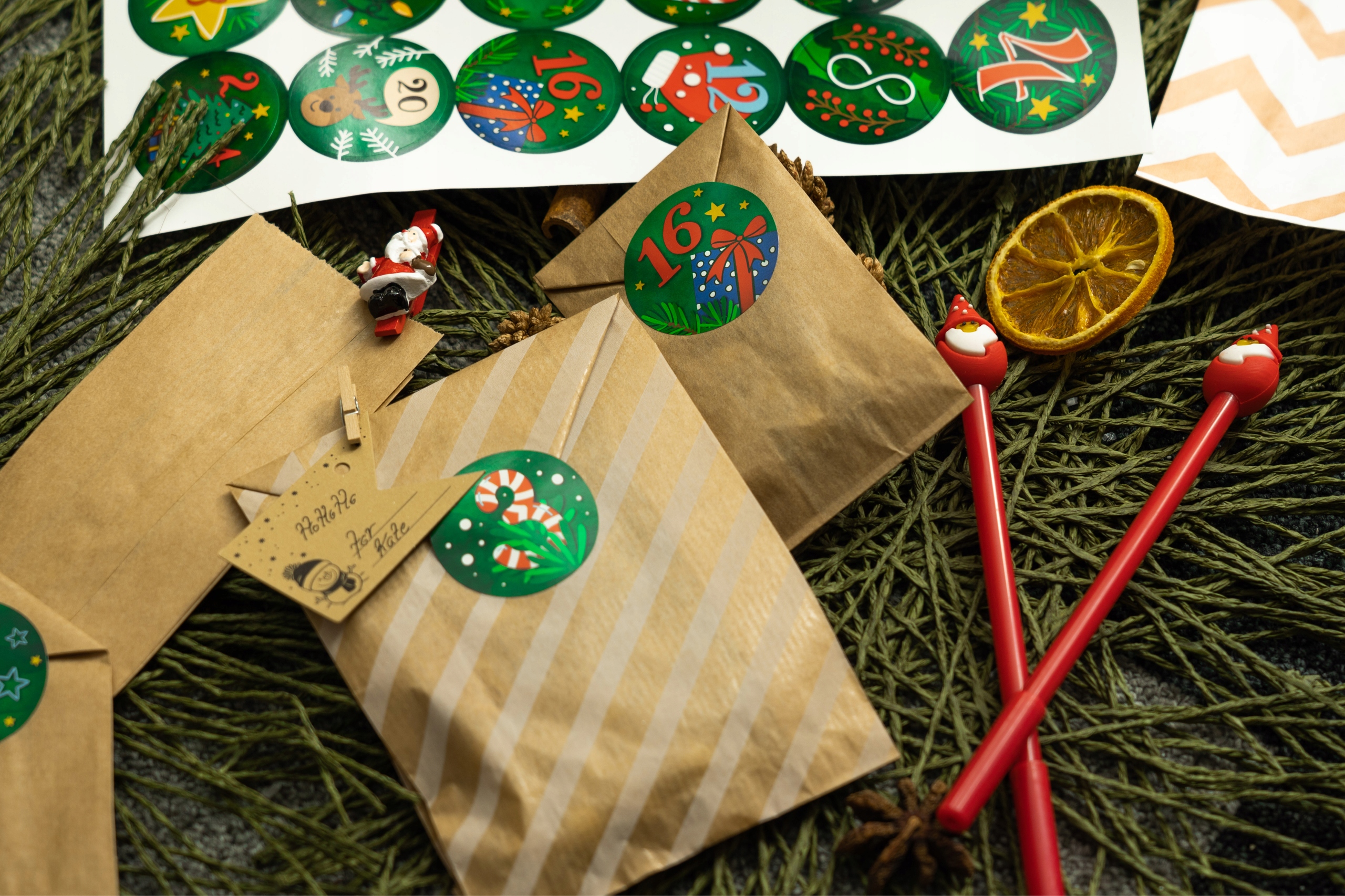 ✨Нумерація: Ви можете легко нанести номери днів Адвенту на кожен пакет, щоб знати, який пакет відкрити. Нумерація може бути написана, наприклад, від руки, або зроблена за допомогою декоративних цифр.