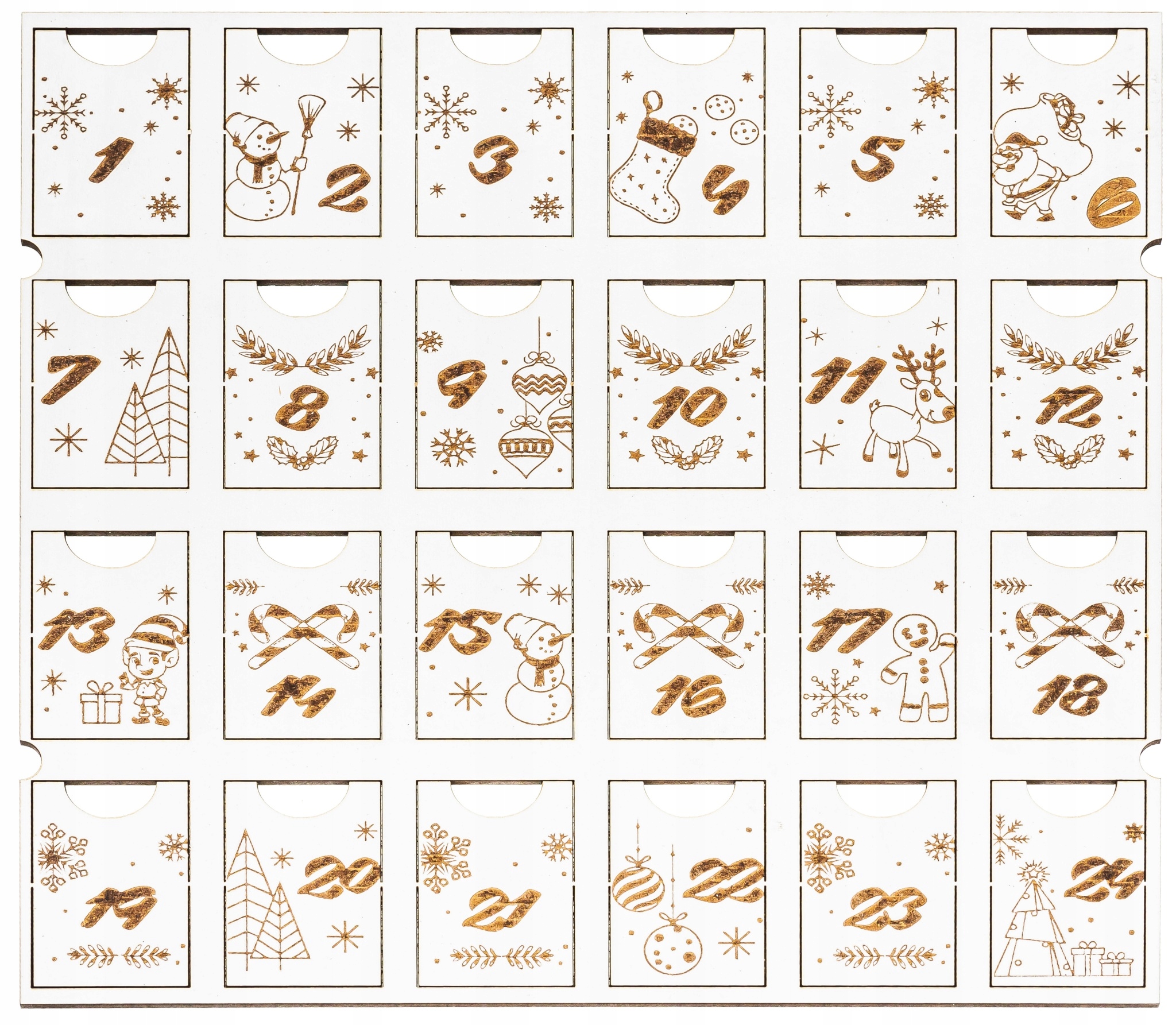 Календар має висувні ящики, які можна легко заповнити, наприклад, солодощами, а потім накрити декоративною кришкою з цифрами.