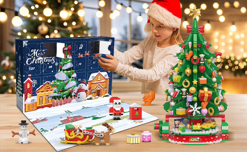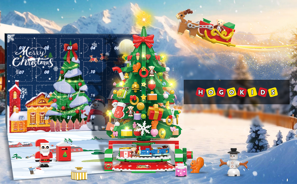 Адвент-календар HOGOKIDS 2024 з обертовою ялинкою та світлодіодним підсвічуванням, 24-денний відлік до Різдва, конструктори з Дідом Морозом, сніговиком та потягом, новорічний подарунок для дорослих та дітей від 8 років (1145 шт.)