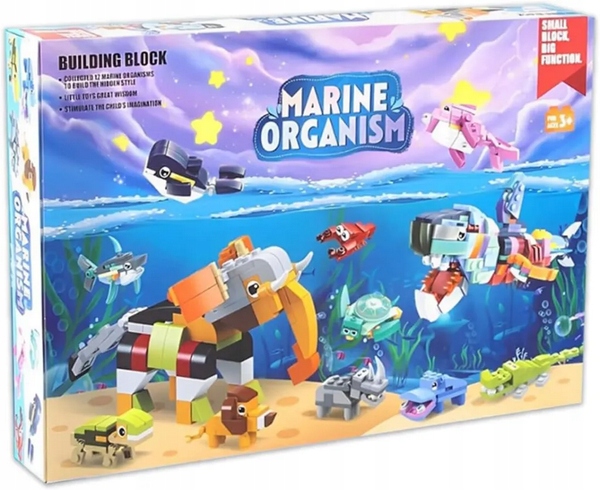 Набір містить 24 міні-набори кубиків, які дозволяють зібрати 24 фігурки тварин (12 морських і 12 наземних) - по одному в кожне вікно. Відкривши всі вікна, ви можете використовувати всі блоки, щоб побудувати дві більші фігури тварин: слона й акулу.