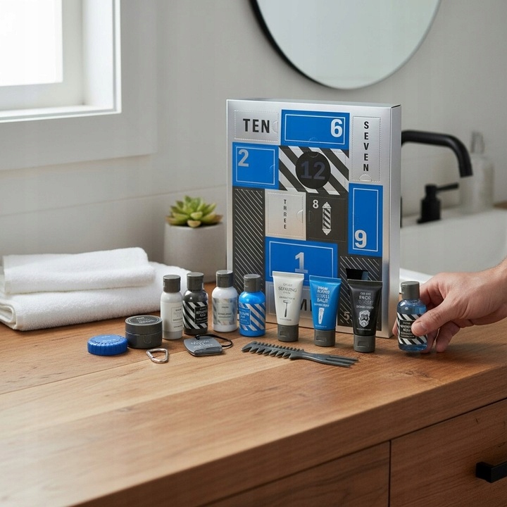 Адвент-календар із косметикою для чоловіків включає 12 ретельно підібраних міні-засобів для догляду та аксесуарів, ідеальних для щоденного догляду – вдома, на роботі чи під час перебування. подорожі.