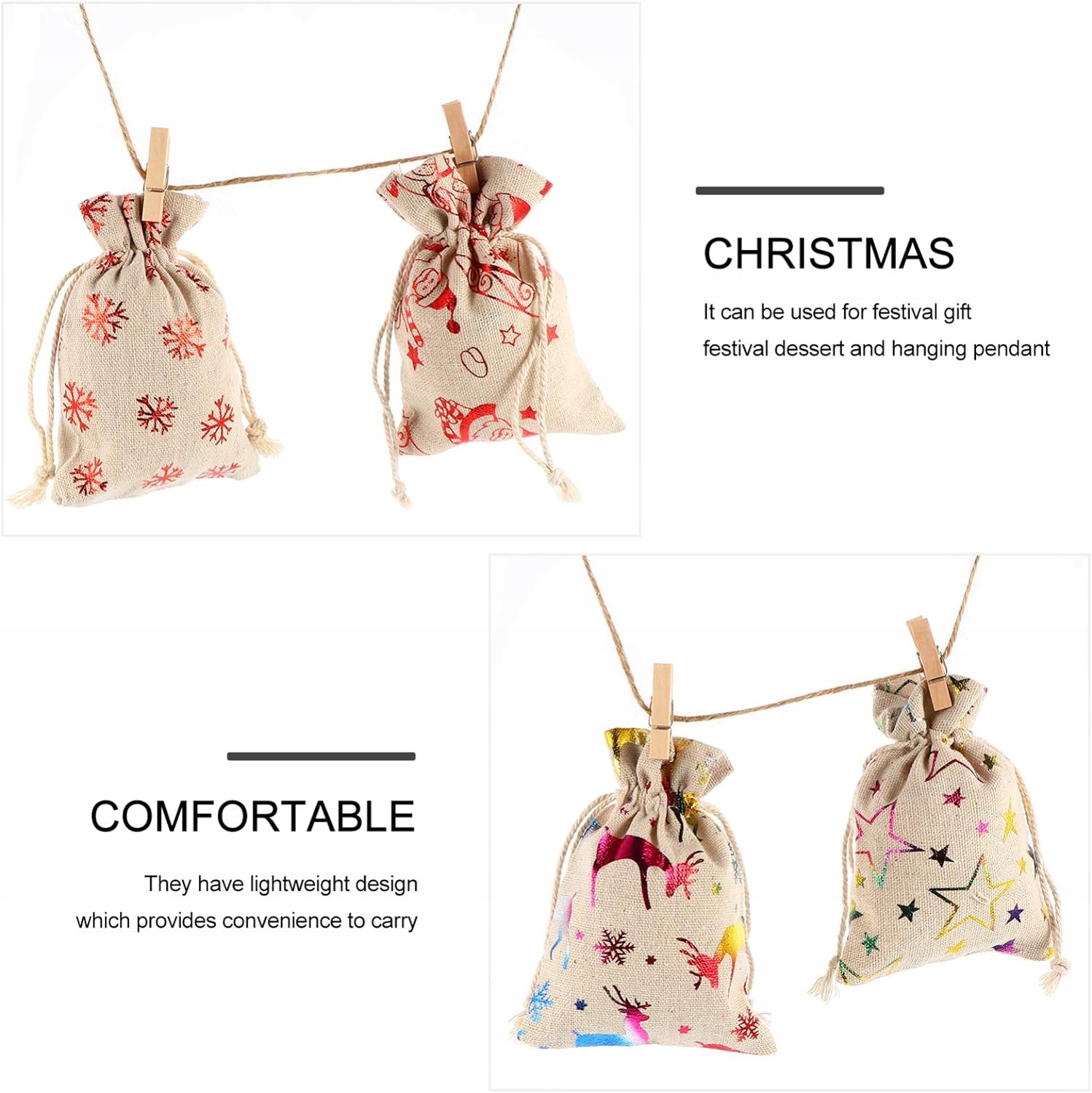 Ви отримаєте 24 джутові пакети (по 2 пакети для кожного кольору), 24 дерев’яні кілочки, 24 наклейки з цифрами та лляний шнурок довжиною .