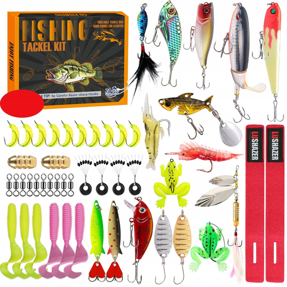 Рибальський набір підходить для всіх видів хижої риби. Набір з 24 рибальських приманок і аксесуарів. У набір входять різні види приманок, такі як жорсткі приманки, м'які приманки і т.д. Приманки імітують рух риби, тим самим залучаючи хижу рибу.