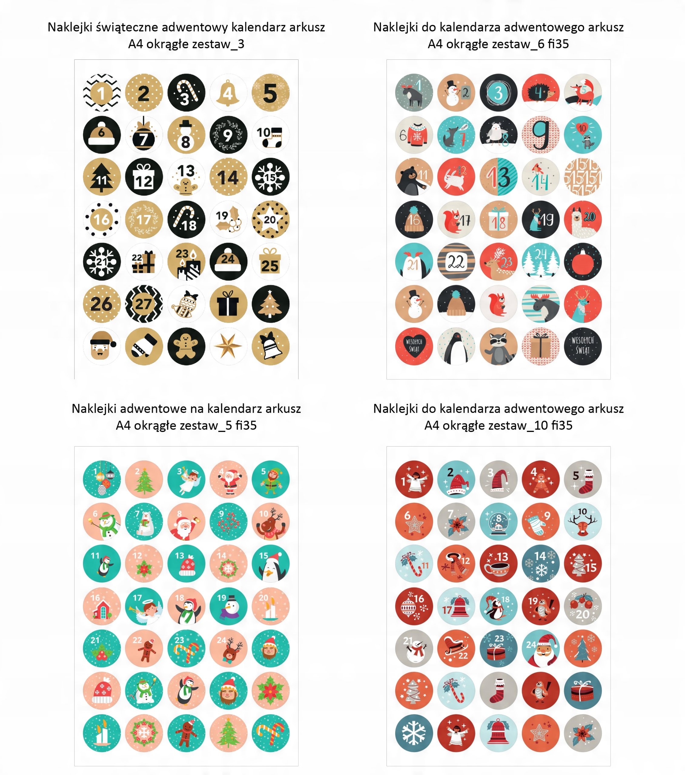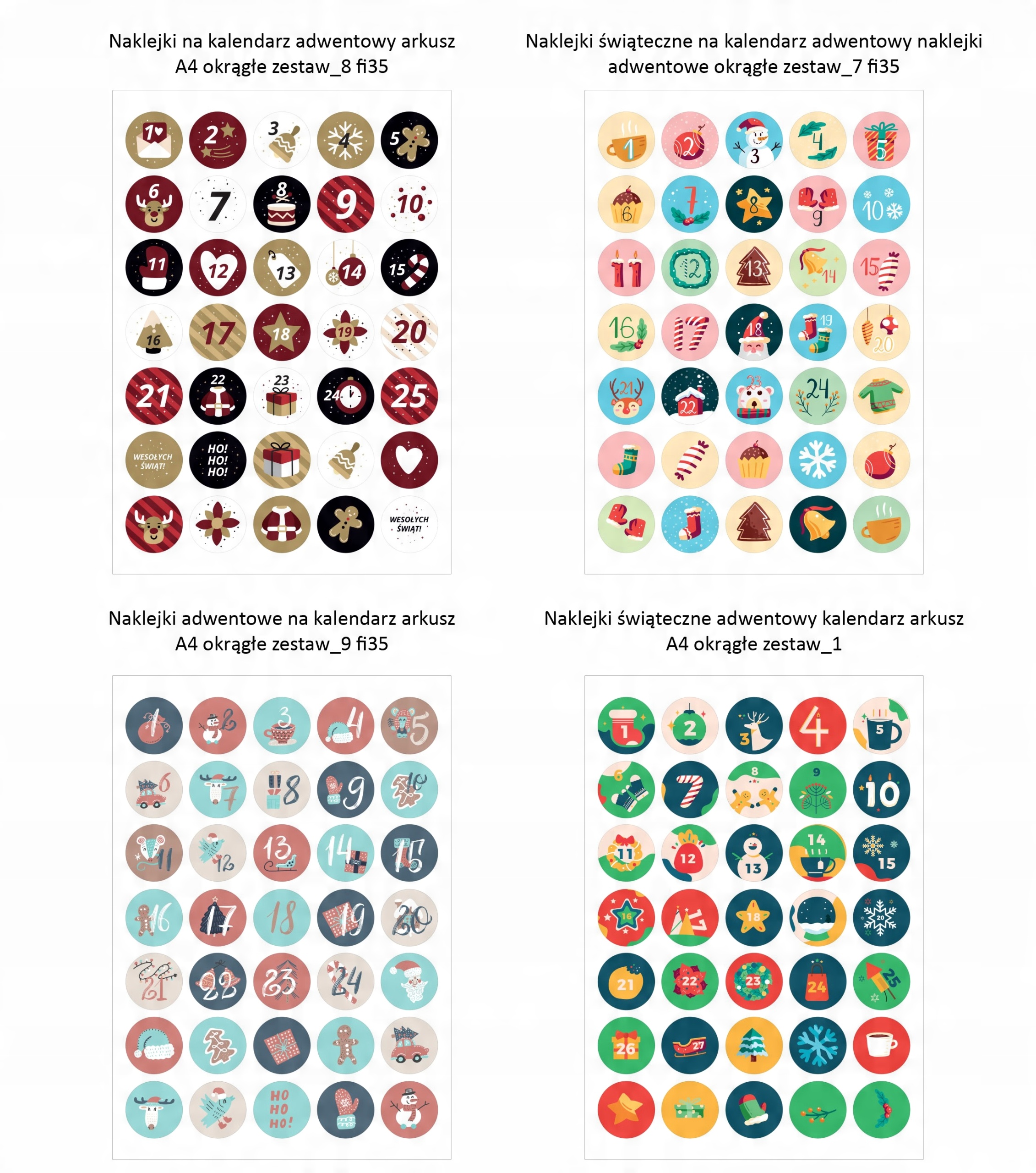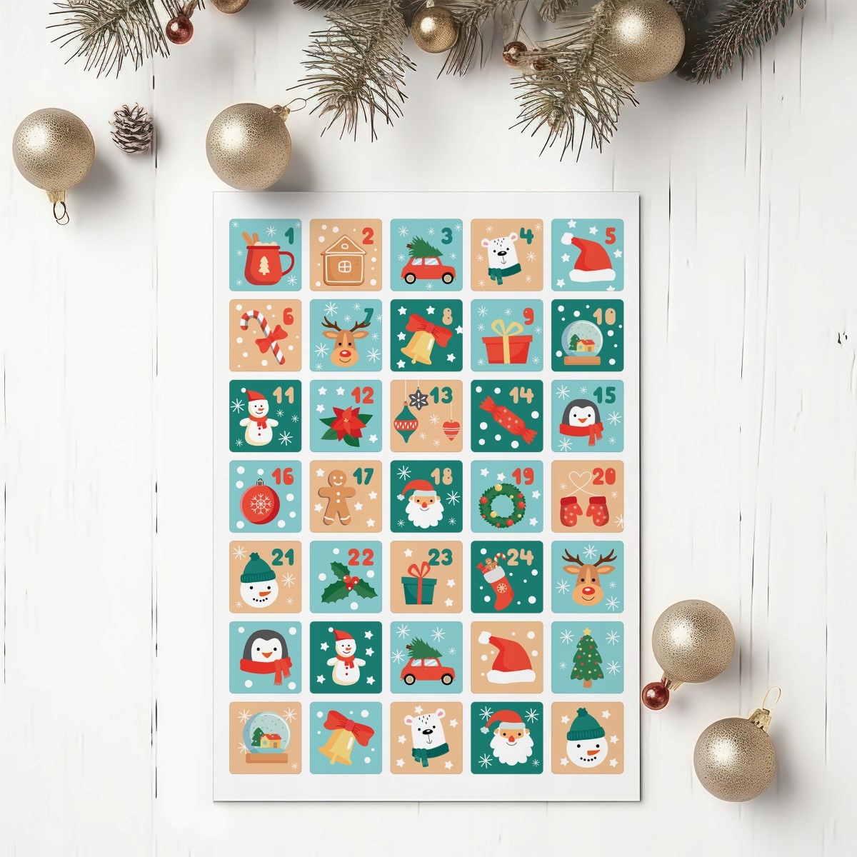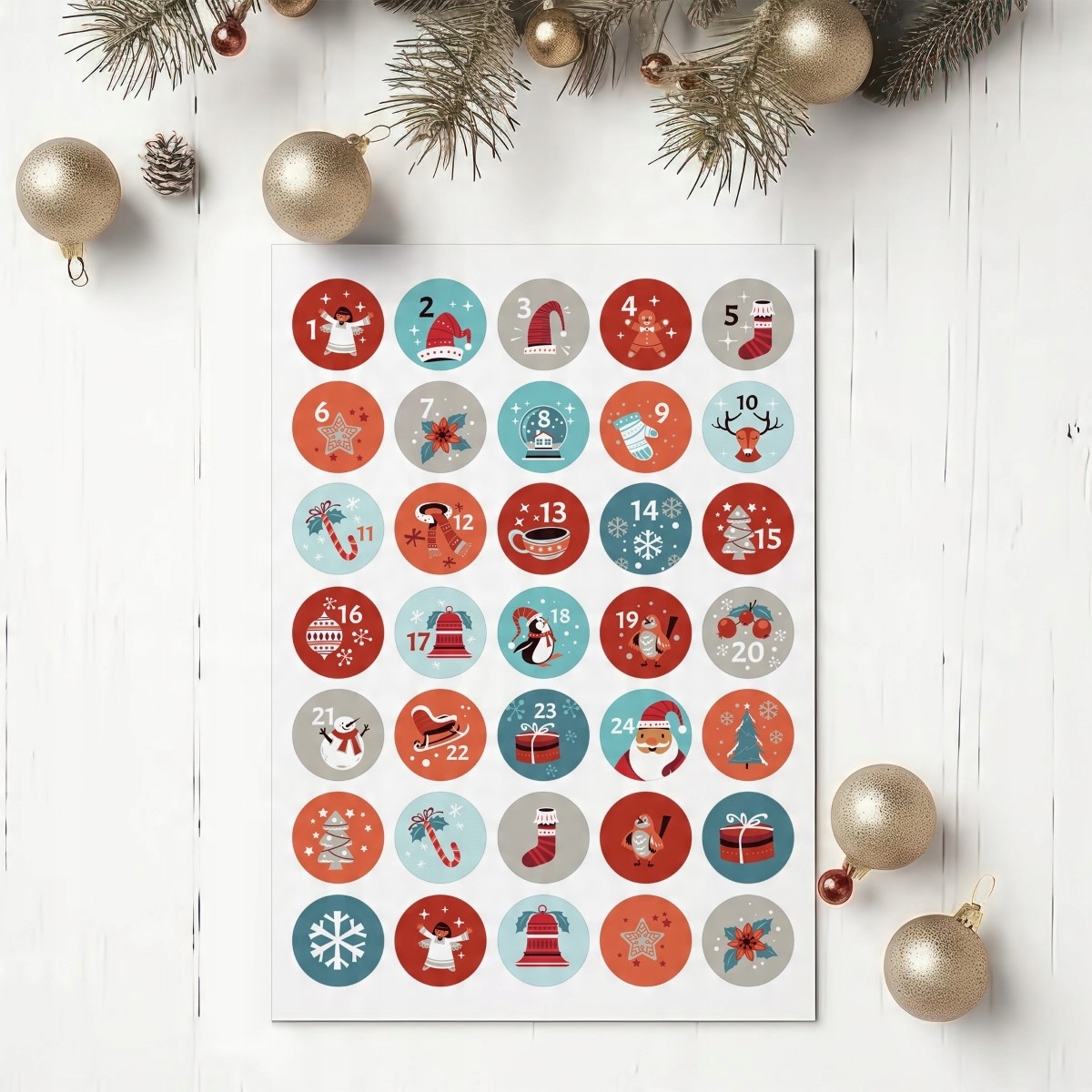 Різдвяні наклейки для адвент-календаря, аркуш А4, 35 штук - різні дизайни.