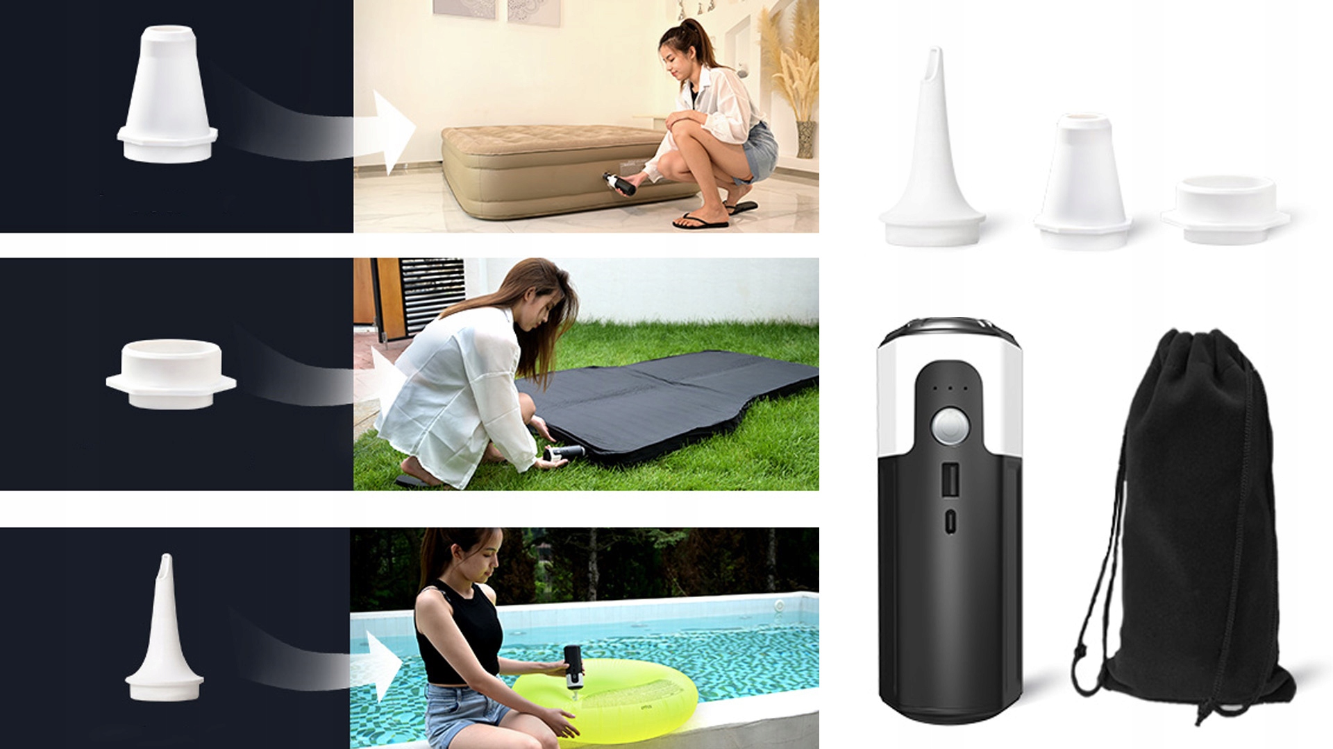 Цей непомітний насос не тільки дозволяє миттєво надувати різні предмети, але також має функцію накачування (функція вакуумного насоса), ліхтарик і Power Bank.