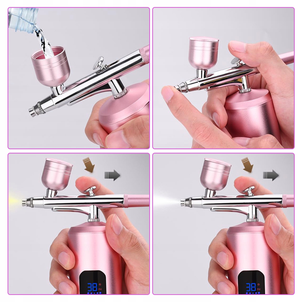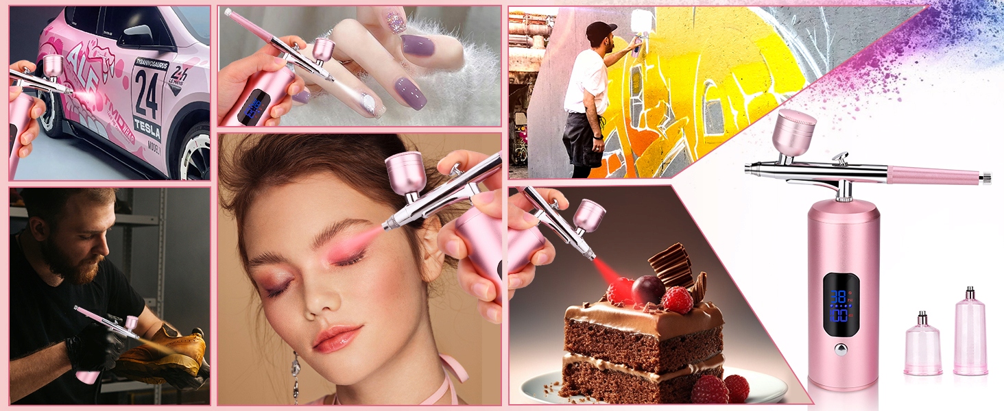 - Це дозволяє швидше застосовувати більш товсті, важчі шари до більших поверхонь. Пневматичний пістолет має 3 рівні тиску (22 фунт / кв.дюйм, 28 фунтів на кв. Дюйм та 38 фунтів на дюйм). 4 Компактний розмір пристрою можна легко переміщувати. 4 Моделювання, виконання тимчасових татуювань, для хобі -цілей тощо