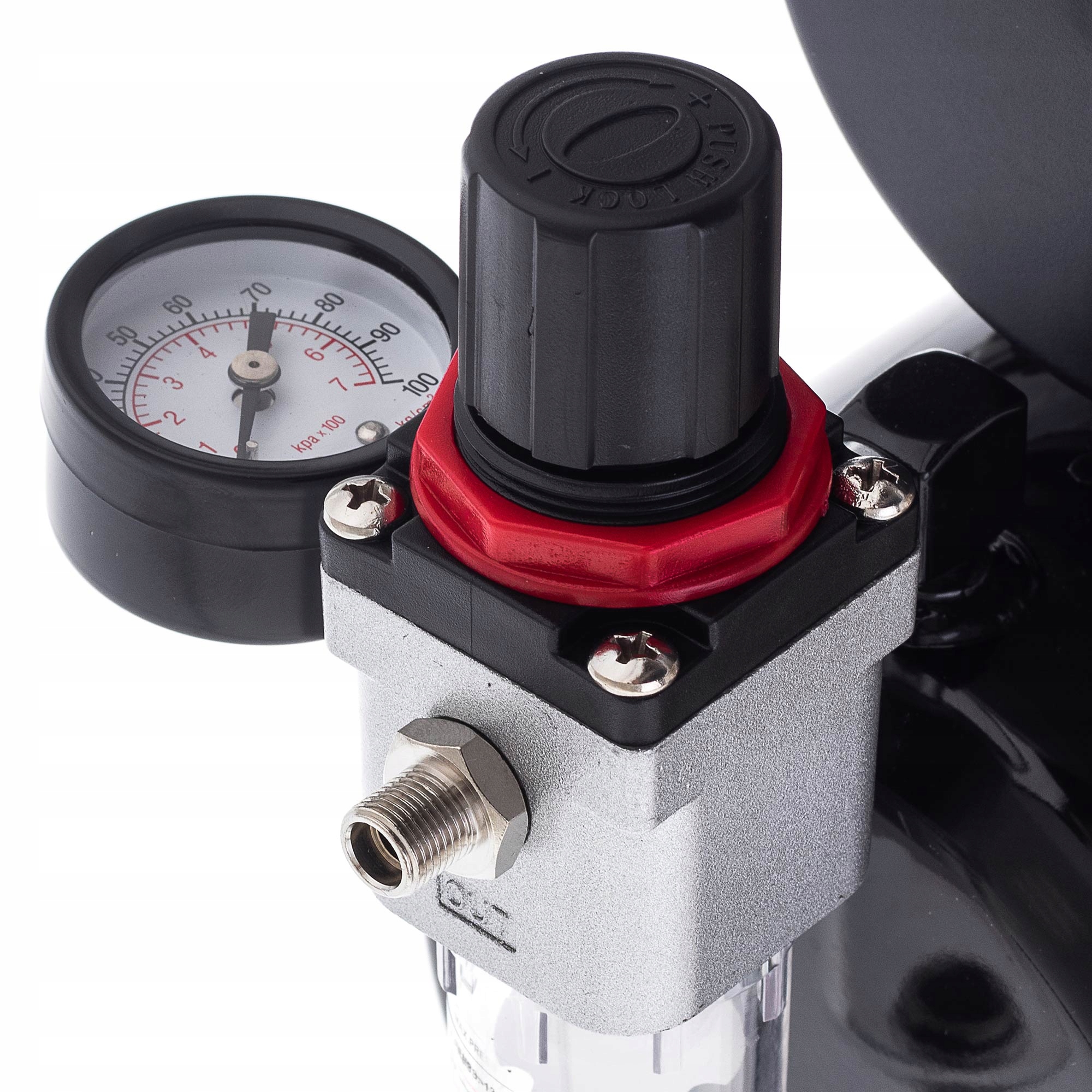 - Редуктор із замком і фільтром: дозволяє точно регулювати тиск. Замок запобігає випадковому повороту ручки. Фільтр вловлює вологу з повітря, подовжуючи термін служби інструментів і підвищуючи якість нанесеного лакофарбового покриття