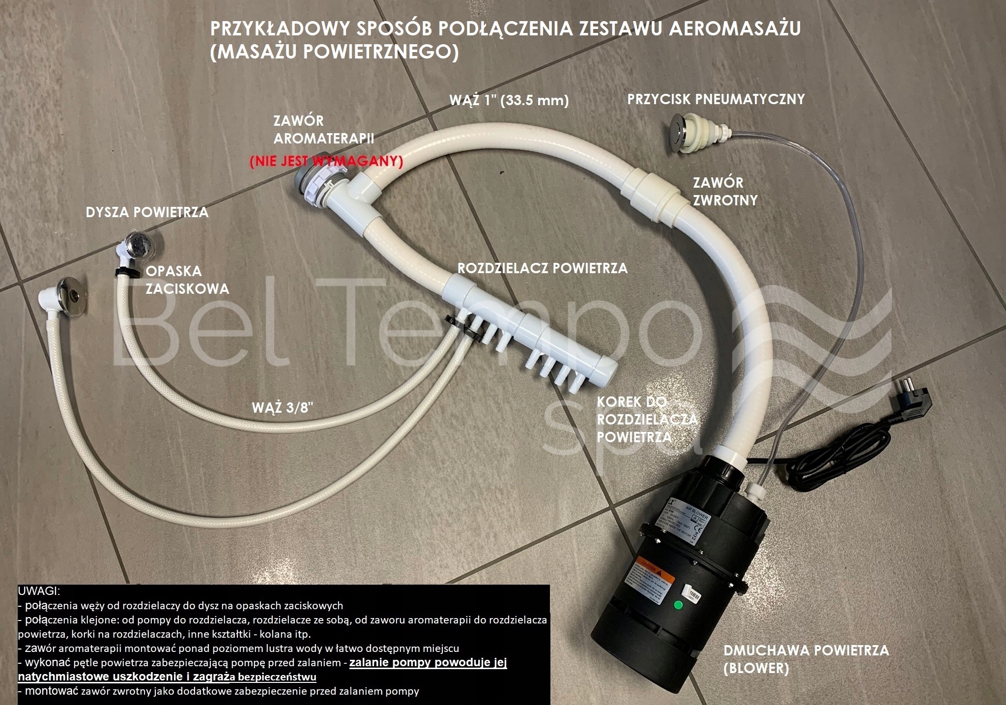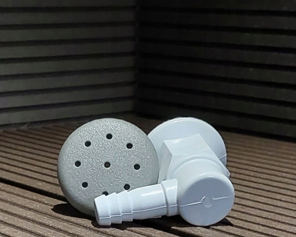 Форсунки для повітродувок підключаються через повітророзподільники (підключення шлангом D15 або 3/8″ на хомутах), розподільники з нагнітачем з'єднуються шлангом D32 або 1″ як з'єднання клеєне. Необхідно встановити зворотний клапан і створити повітряну петлю над рівнем води, щоб вода не потрапляла в повітродувку.