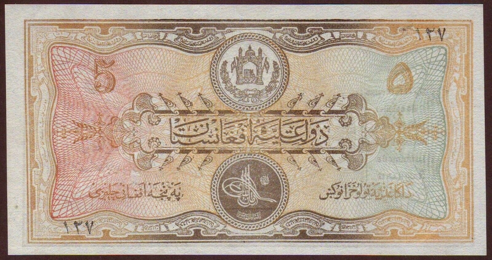 AFGANISTAN 5 Afghanis 1926-1928 P-6 UNC