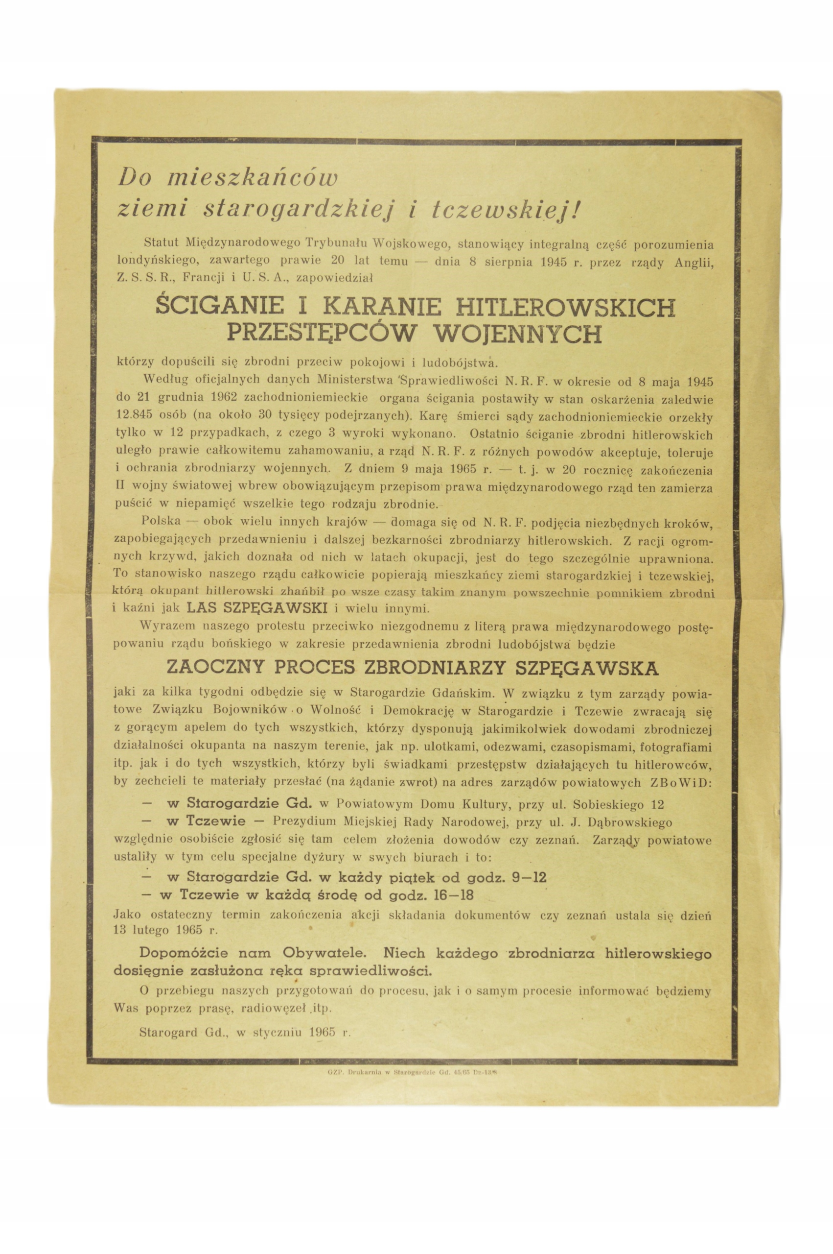 AFISZ STAROGARD GDAŃSKI PROCES ZBRODNIA SZPĘGAWSKA 1965 r. RZADKOŚĆ