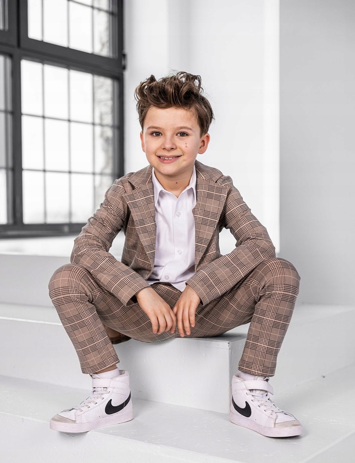 Елегантний плед -куртка, закріплена однією кнопкою та зручними плед -штанами, на талії на гумі, з манекеном і кишенями. дитячі рухи.
