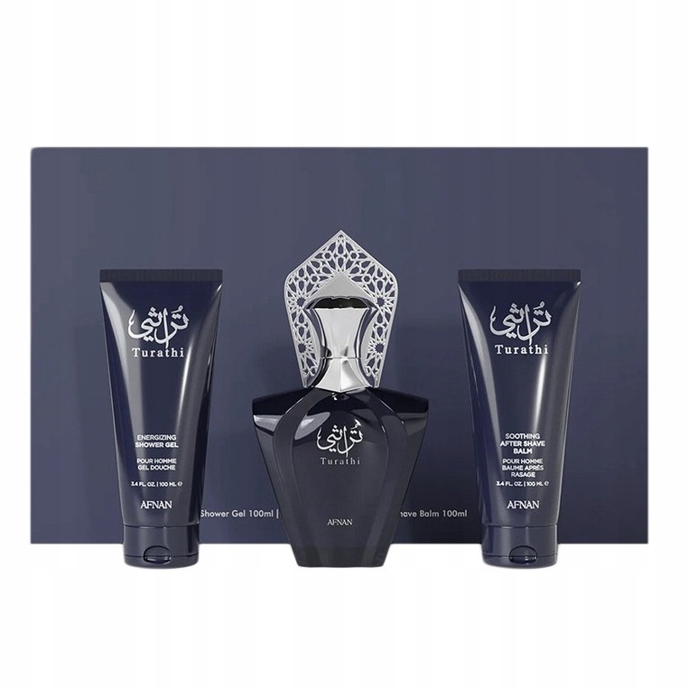 Turathi Blue Pour Homme — елегантний і сучасний аромат для чоловіків, який гармонійно поєднує свіжість з глибокими чуттєвими акцентами. Композиція, створена брендом Afnan у 2021 році, підкреслює чоловічу впевненість у собі та неповторний стиль. У набір входить: парфумована вода 90 мл, гель для душу 100 мл і бальзам після гоління 100 мл. Ідеальний вибір як подарунок або для щоденного догляду.