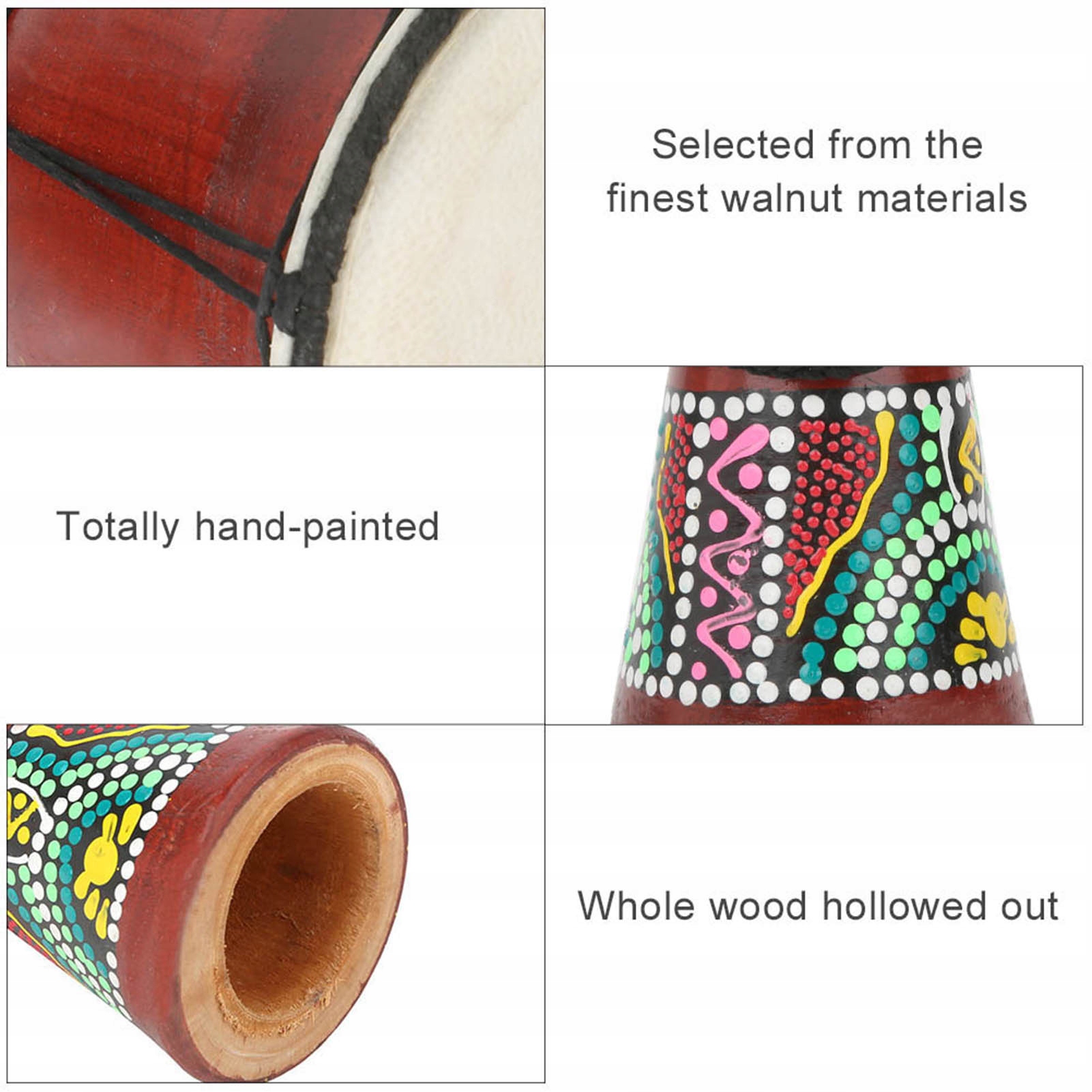 1. Пофарбований ручний барабан вибрано з найкращих матеріалів горіхового дерева. Машина використовується для точної форми, вся деревина видовбана та повністю розписана вручну, дуже красиво.