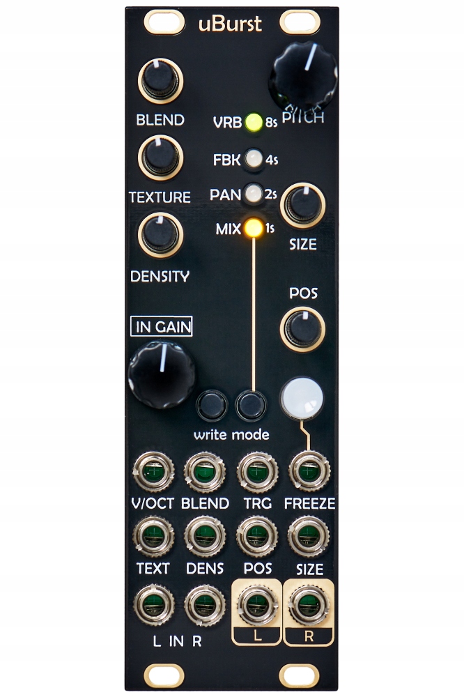 uBurst — це гранульований аудіопроцесор, який зосереджується на реальних часова обробка сигналів, що подаються на вхід, які розбиваються на 40–60 зерен (окремих частинок) тривалістю від 16 мс до 1 секунди. Зерна можна змінювати за допомогою маніпуляцій з аудіобуфером, розміром семплу, текстурою, висотою/зсувом, і в кінцевому підсумку це може стати безперервною текстурою, стратифікованим «звуковим потоком» або ритмічним хаосом. Поєднання звуків, що перекриваються, затримуються та/або перекладаються, пропонує величезний творчий потенціал. Положення, розмір, крок, підсилення, щільність, текстура та змішування доступні як елементи керування, усіма з яких можна керувати CV. Позиція контролює позицію зразка зразка, а «Щільність» означає щільність зерен. Від позиції 7 годин до центральної позиції аудіоматеріал відтворюється в постійному темпі, який втрачає точність у міру наближення до позиції 12 годин. Коли повзунок проходить центральне положення та переміщується до положення «5 годин», швидкість відтворення аудіоматеріалу, що відтворюється в нерегулярному темпі, прискорюється. «Текстура» змінює характер зернистої оболонки та трансформується від пом’якшення перехідних процесів за допомогою дифузора (кінцева позиція) до жорсткіших варіантів у центральній позиції (трикутник) і лівій зупинці (прямокутник).