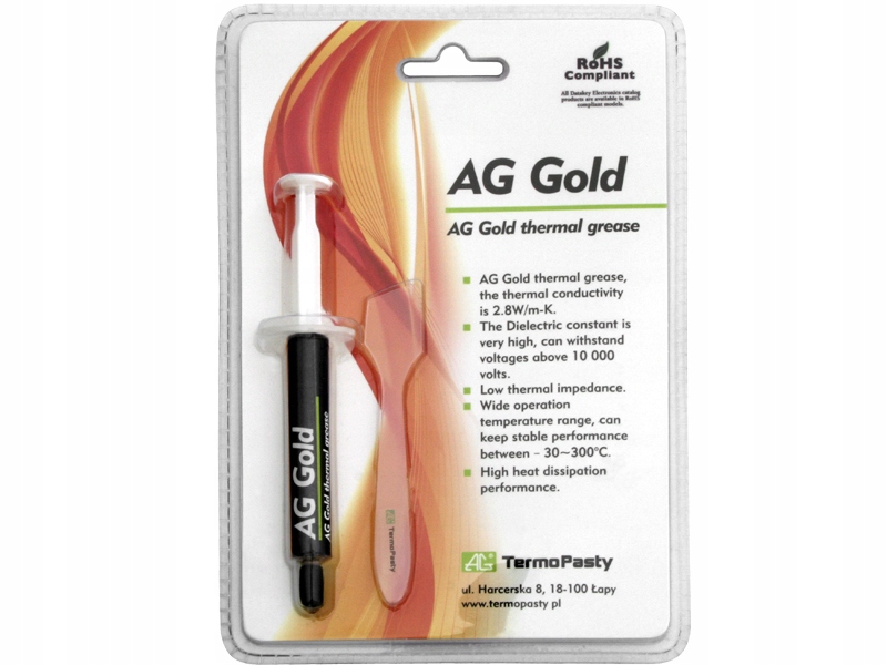 AG Gold — високоякісна термопаста. Завдяки 45% вмісту золота її теплопровідність в 3 рази вище, ніж у звичайних термопаст. Це дозволяє знизити температуру процесора приблизно на 6 градусів навіть без заміни радіатора. Паста є найкращою альтернативою для оверклокерів.