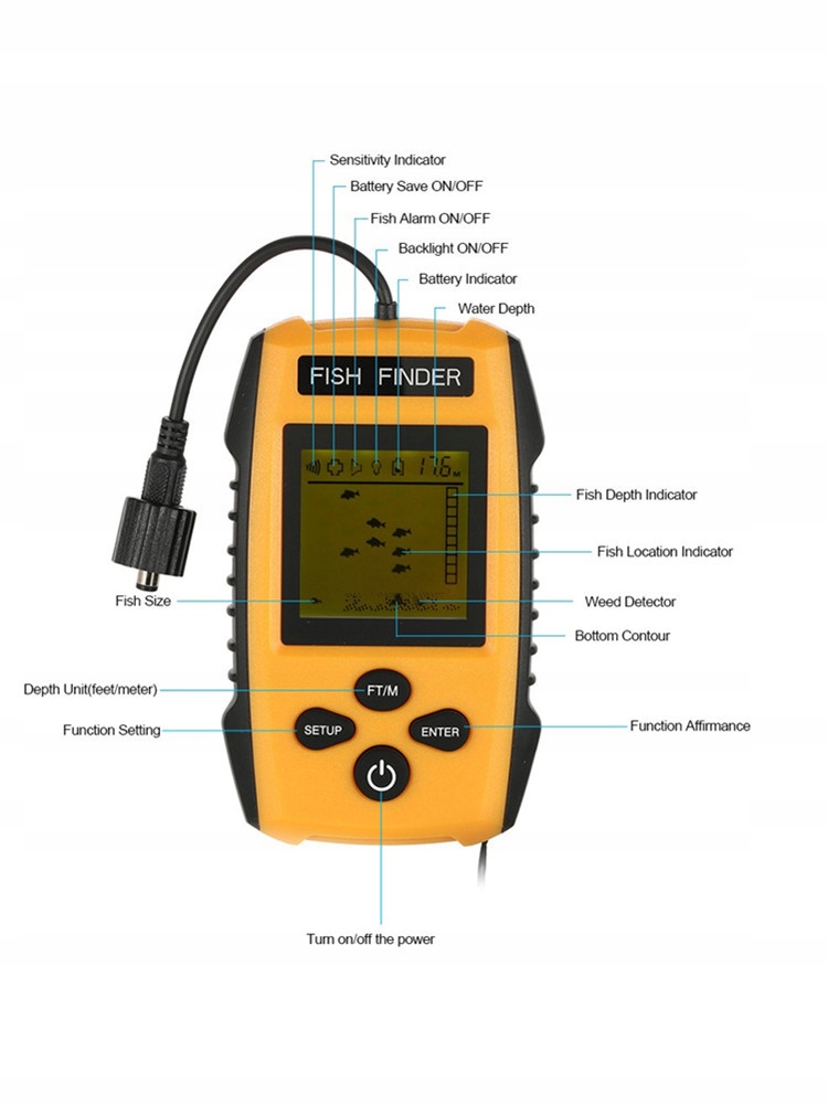 - Це портативний ехолот, який може відображати приблизне місцезнаходження риби та глибину води. До корпусу байдарки чи човна можна прикріпити датчик гідролокатора, щоб розуміти зміни глибини води під час руху. Діапазон визначення глибини води становить від 1 м до 100 м, коли датчик повністю занурений у воду.