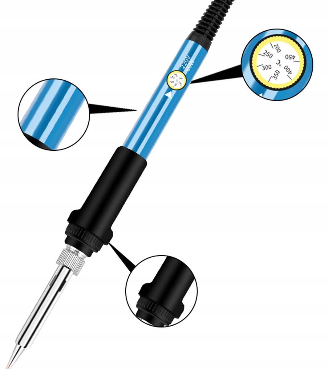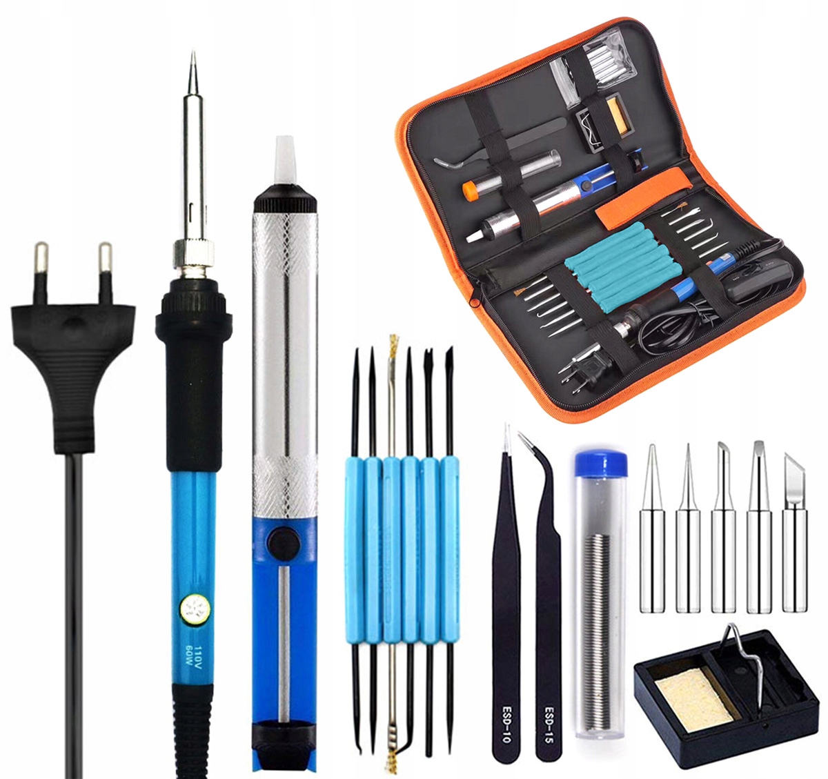 Резистивний паяльник з регулюванням температури - незамінний інструмент в кожному сервісному центрі або в домашньому гаражі. Ідеально підходить для пайки SMD і компонентів з невеликими отворами. Він дуже легкий і зручний у використанні, а ергономічна форма і довгий кабель живлення значно полегшують роботу. У набір входить багато аксесуарів, таких як спеціальна підставка, запасні наконечники, жерстяна дріт, пінцет та інші додаткові інструменти. Все це було поміщено в зручний футляр із застібкою-блискавкою.