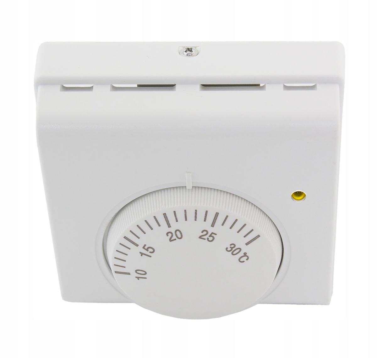 Кімнатний термостат, регулятор температури. Оснащений зручною механічною ручкою регулювання температури і сигнальним діодом (режим роботи). Легкий монтаж і простота використання (велика ручка). Він дозволяє регулювати температуру від 10 градусів до 30 градусів Цельсія. Термостат дозволяє контролювати нагрівання (включення циркуляційного насоса) або охолодження (включення вентилятора). Продукт призначений для використання всередині приміщень.