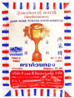 Агар-агар - це речовина рослинного походження, яку отримують з червоних водоростей, тобто водоростей. Містить клітковину (80%), омега-3 жири, фолієву кислоту та вітаміни К, Е і В6. Повністю натуральний і несмачний, він є чудовою альтернативою тваринному желатину. Агар потрібно дуже ретельно розчинити при температурі 85-95 градусів за Цельсієм (щоб прибрати морський запах), а застигає при 32-35 градусах. В азіатській кухні агар-агар використовують, серед іншого, для приготування: десерти та желейні страви.