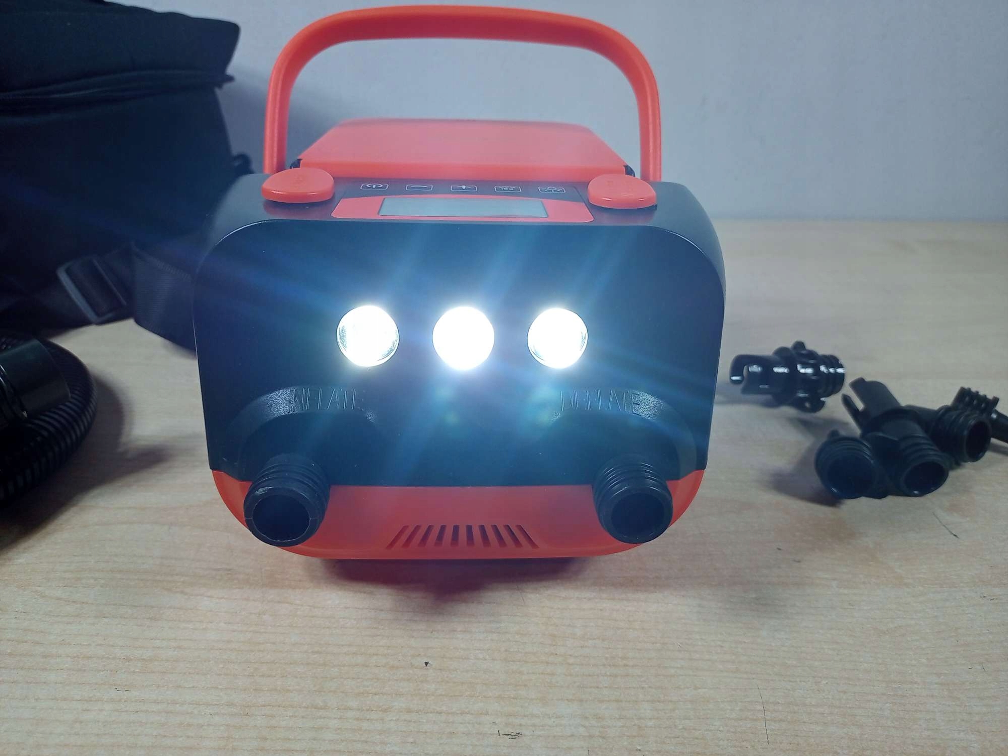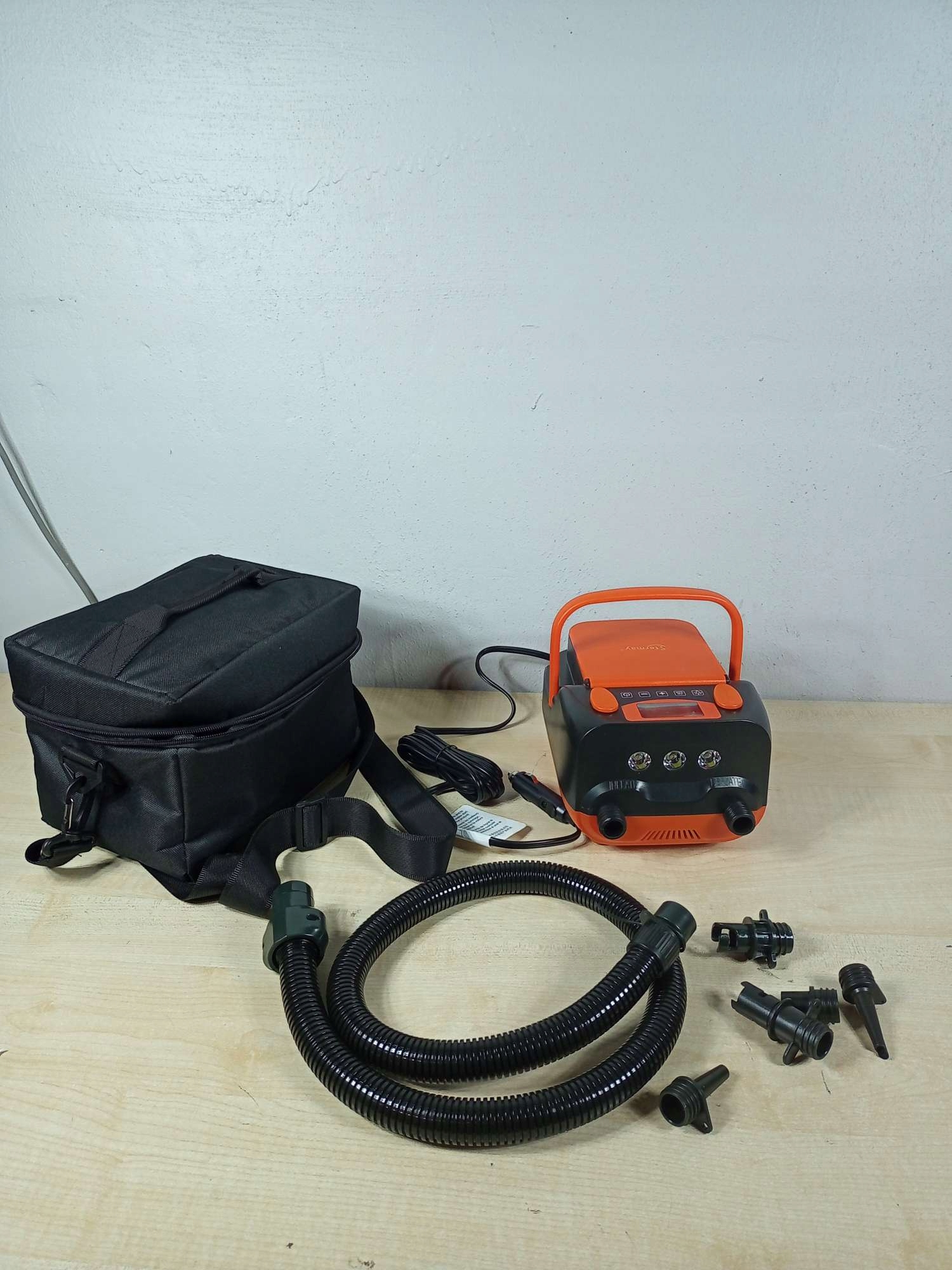 насос оснащений змією довжиною 1 метра, що забезпечує більше мобільності та зручності при перекачуванні та зливанні повітря. Ідеальний для надувних дощок SUP, водного обладнання, надувних матраців та наметів. місце . Ви можете зарядити його за допомогою різних джерел , наприклад, на автомобілі запальнички, що робить його ідеальним рішенням для поїздок. сенсорна панель управління. Крім того, побудований світлодіодний ліхтарик полегшує використання пристрою в умовах поганого освітлення.