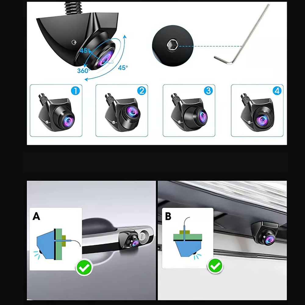 🚗🚗【Обертання на 360°, регульований кут 45° і широкий кут на 170°】 У порівнянні зі звичайними автомобільними камерами заднього виду камера реєстратора може отримати найкращий огляд, повернувши частину об’єктива камери заднього виду на 360° за допомогою міні-гайкового ключа, щоб ви могли встановити камеру в будь-якому положенні. Широкий кут огляду 170° ідеально підходить для усунення сліпих зон, забезпечення кращої видимості під час руху чи паркування та ефективного уникнення зіткнень з перешкодами та подряпинами.