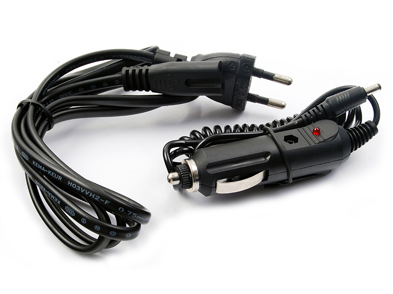 На заводі він обладнаний європейською (польською) вилкою та довгим кабелем, що дозволяє працювати далеко від електричної розетки. У комплекті 2 кабелі: мережевий кабель 230 В (довжина приблизно 1,5 м) і 12 В (для зарядки в автомобілі - довжина приблизно 1 м).