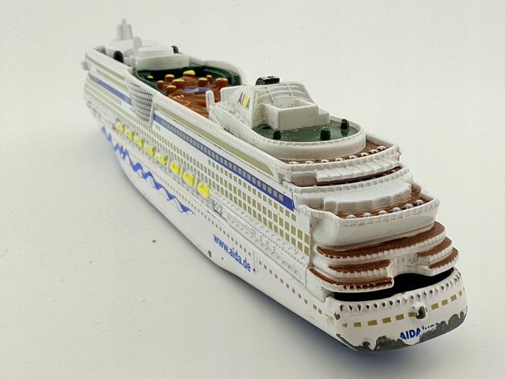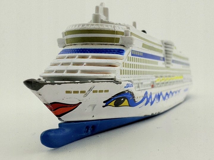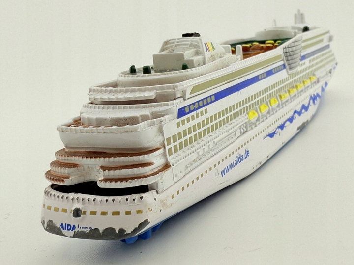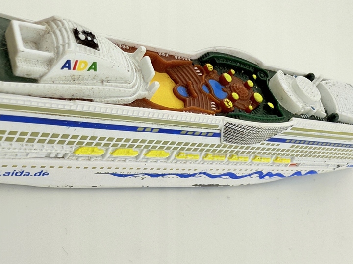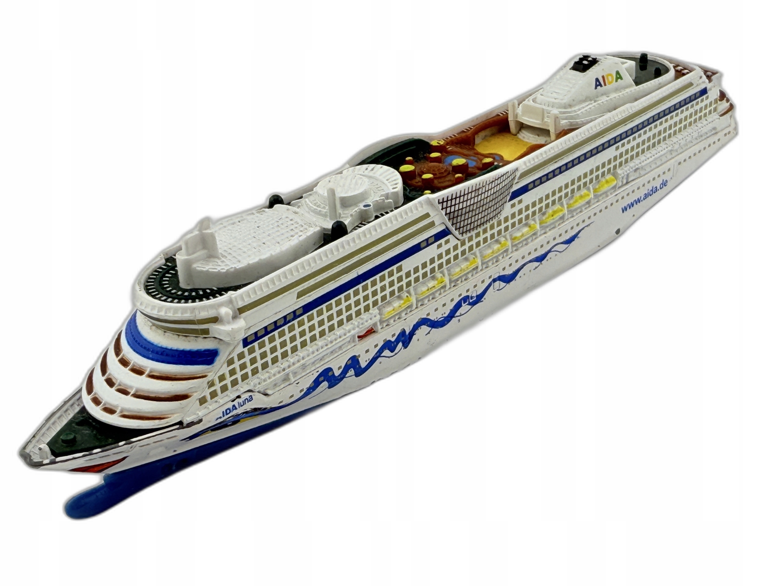позначка: siku • Модель: Аїда Луна (Круїзний корабель) • Виробник: Ceper GmbH • Масштаб: 1:87 • Умова: Використовується • Матеріал: метал+пластик • Довжина (мм): 160 мм (на основі фотографії з лінійкою) • Кольори: Білий із синіми та зеленими акцентами • Додавання: детальна картина, реалістичні деталі • Номер каталогу: 11172000001 • Зроблено в: Китай